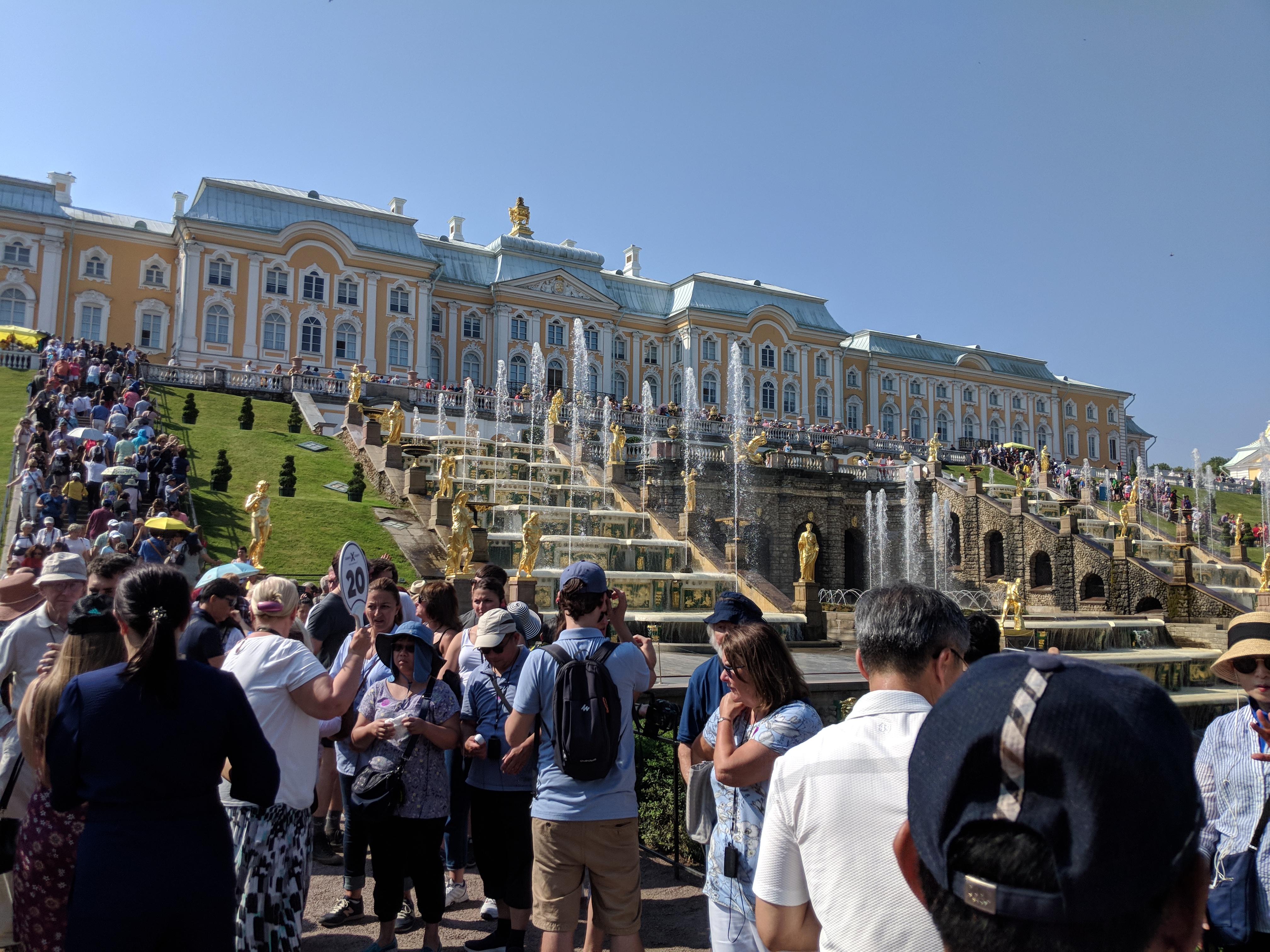 Пристигнахме в Петерхоф и още със стъпването на земята се усещаше едно невероятно спокойствие. Веднага правеше впечатление колко е чисто и подредено … и колко хора имаше на опашката разбира се.