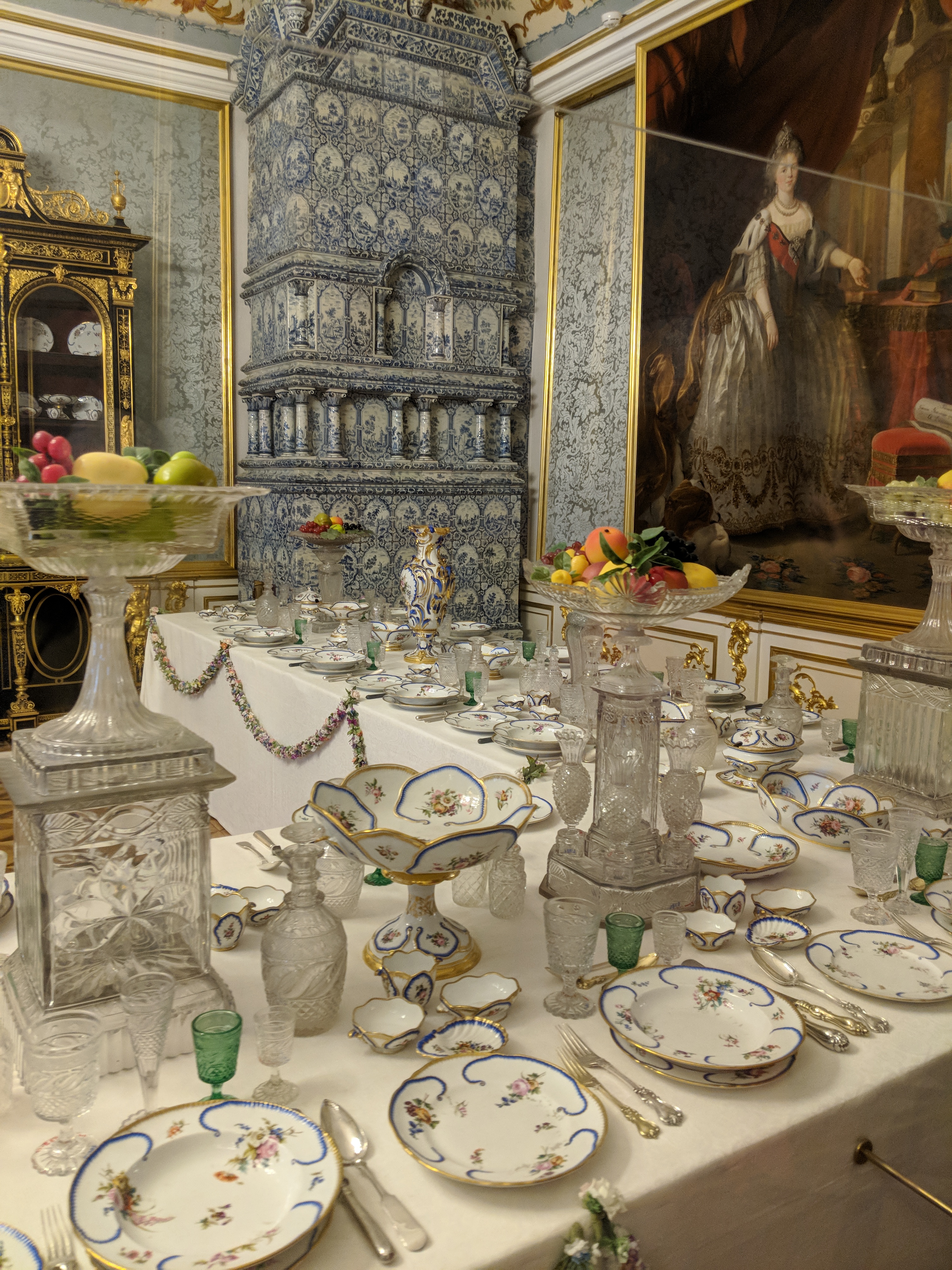 Бялата столова пък е мястото, където са присъствали на изящни вечери 30-те поканени гости от Екатерина Велика. Порцелановите прибори са поръчани от фабриката на Josiah Wedgwood в Англия. Стаята е украсена с кристални полилеи като в южната ѝ част се намира позлатен часовник изработен по поръчка в Берлин.
