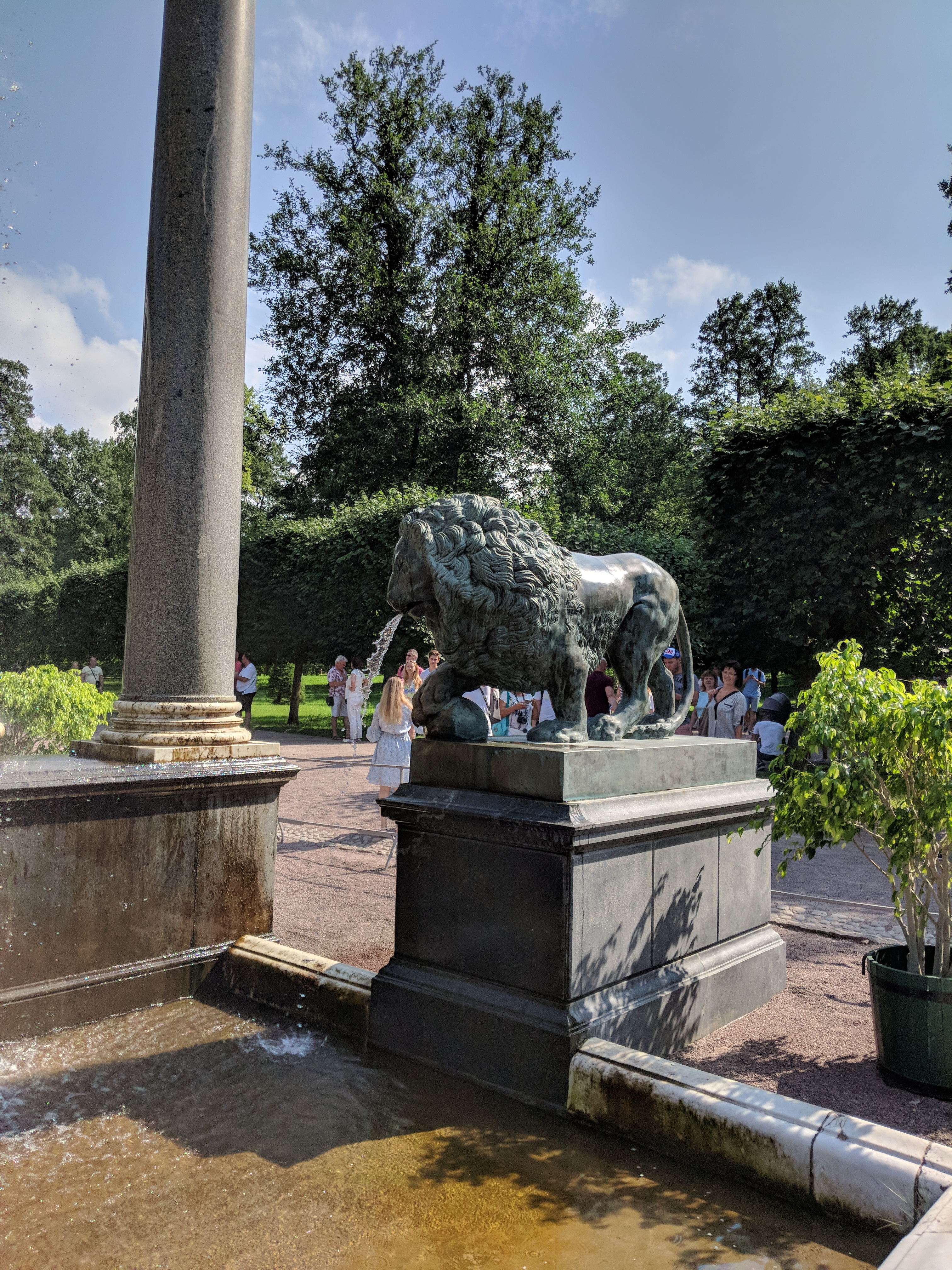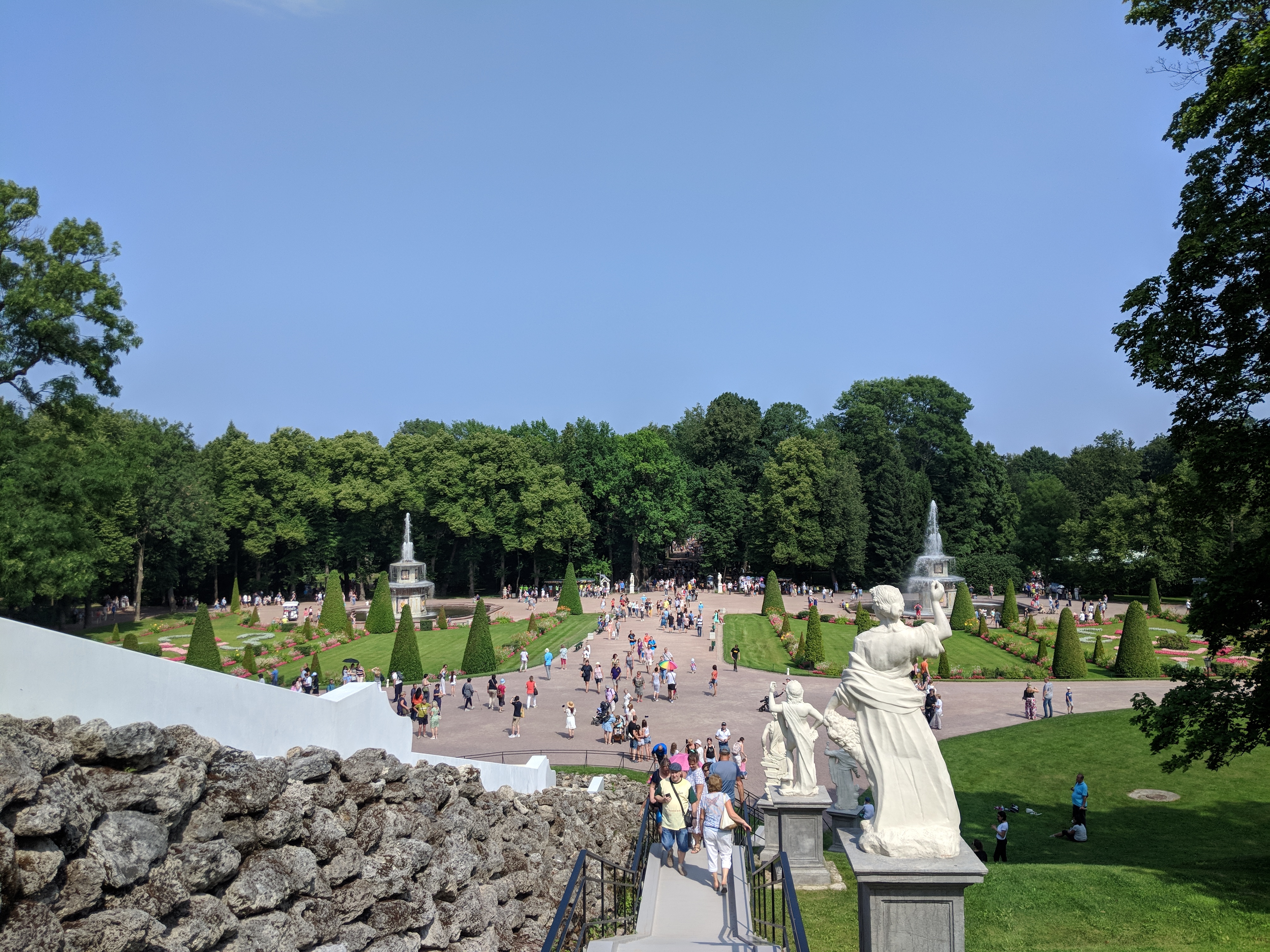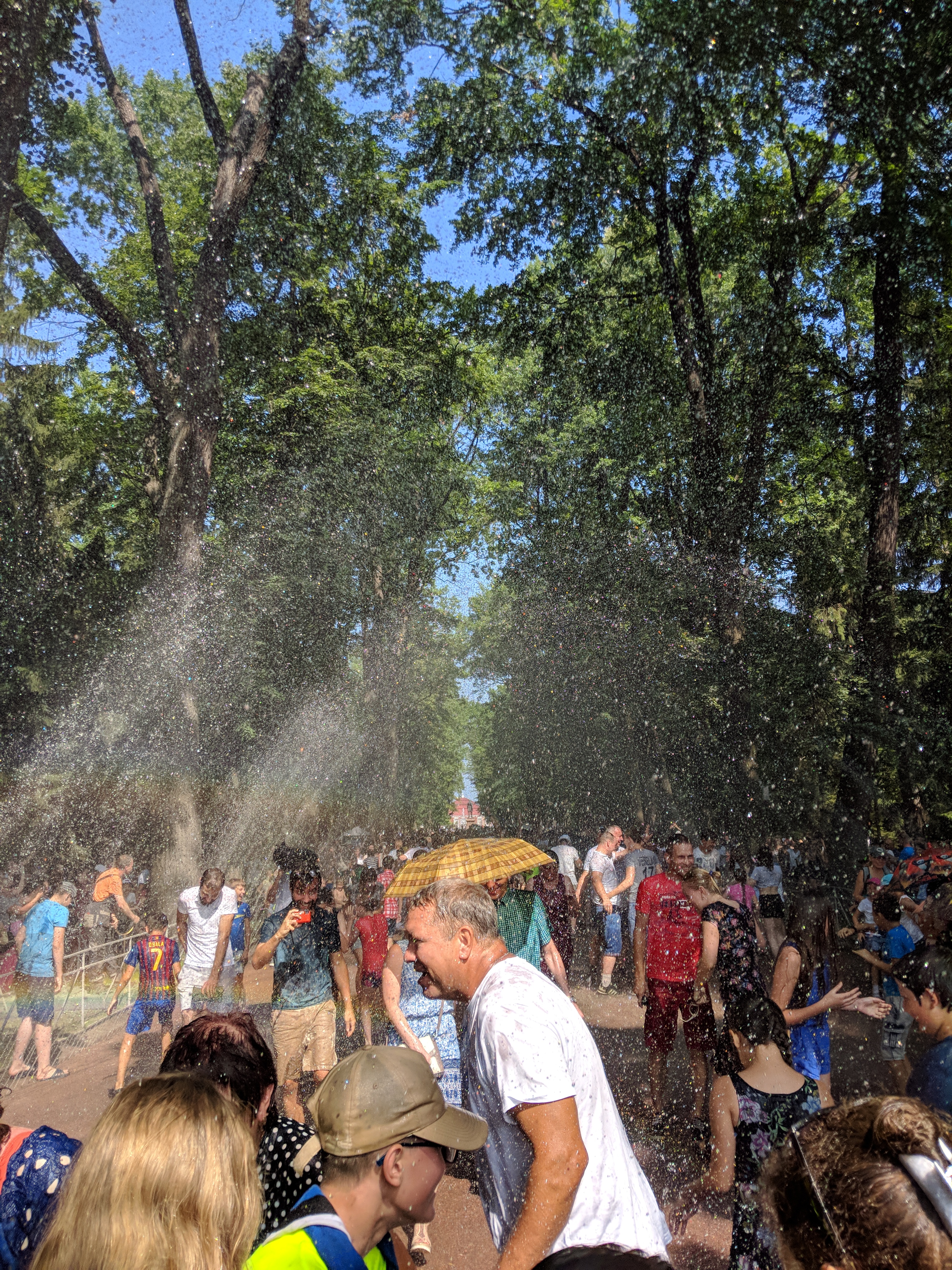Паркът е огромен и е наслада за окото, има множество малки будки за закупуване на „мороженое“ (сладолед) и вода, но не е претъпкано. И въпреки това така и не успях да простя на Петър Велики, че не се е сетил да включи една проклета чешма в плановете на архитектите. Тонове злато по фонтаните, а няма къде една проклета вода да пиеш без пари.