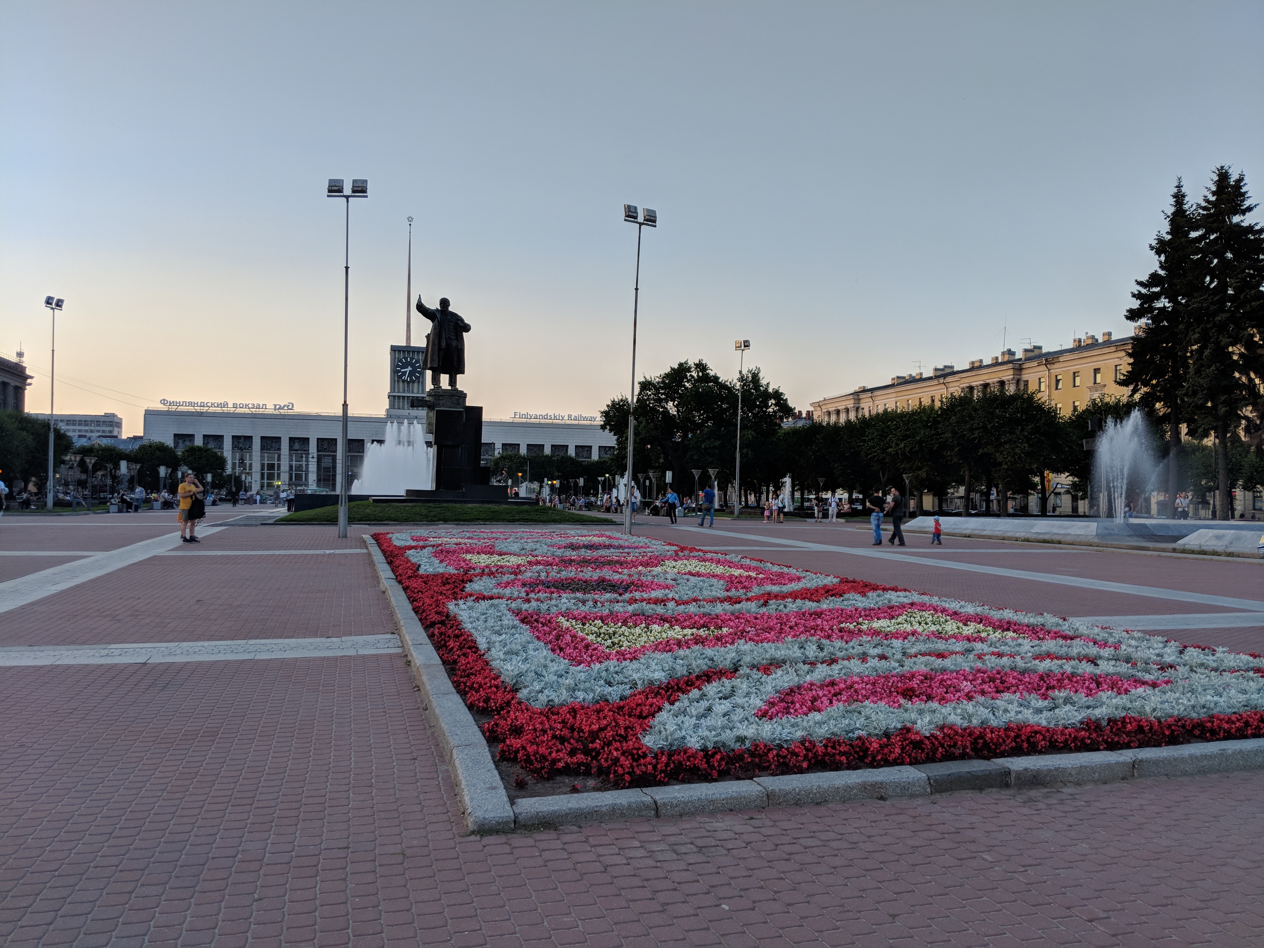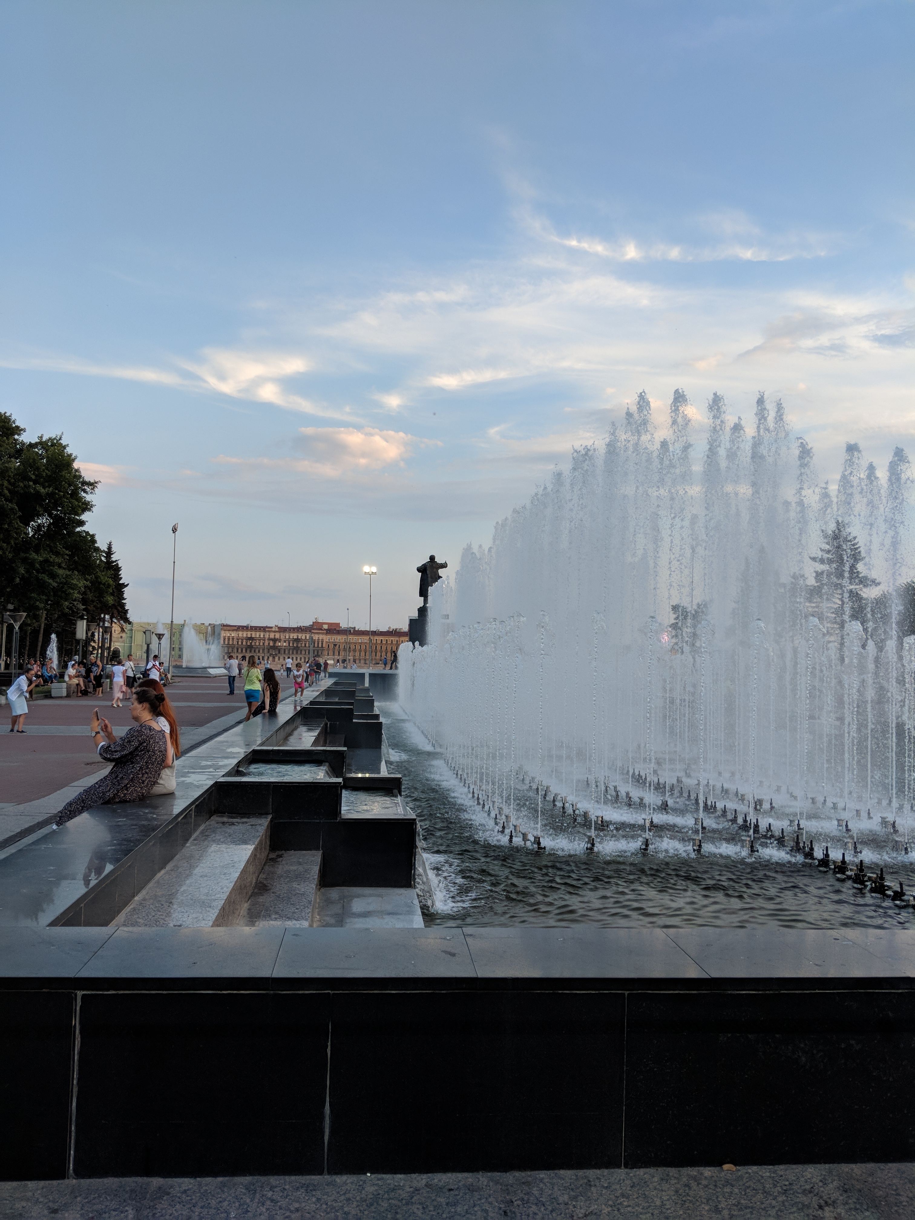 На излизане от крепостта все още имах време за разходка, че нали денят е дълъг там и се стъмва късно. Качих се на метрото и отидох на площада на Ленин. Намерих едно много закътано квартално магазинче, взех 2 бири и ги довърших пред гледката на фонтаните. Всъщност публичното употребяване на алкохол е забранено в Санкт Петербург, но пък бирите ми ги дадоха в хартиени опаковки и нямаше проблем. Много ми хареса колко чист и подреден беше площадът. Имаше много млади хора, звучеше музика, докато шадраваните се издигаха и сваляха. А и залезът правеше обстановката достатъчно романтична.