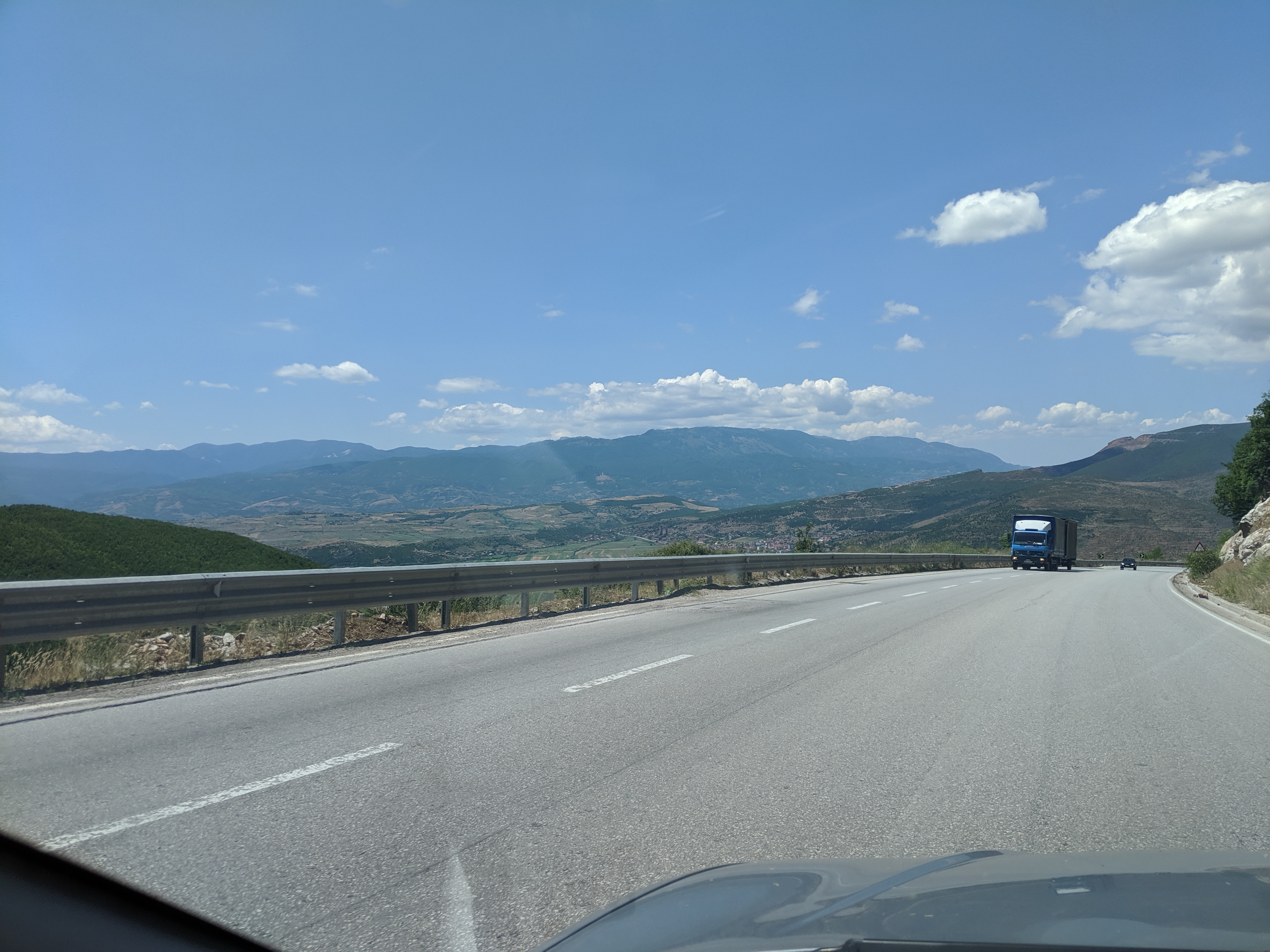 До границата пътуването бе безпроблемно. Минахме я на Гюешево – Крива Паланка и почти не сме чакали. От там до Скопие ни отне около час и половина или два, но не сме бързали. Пътят е тесен, с много завои, нямаше много тирове, но въпреки това не позволяваше голяма скорост. И тук отварям темата за македонските шофьори.