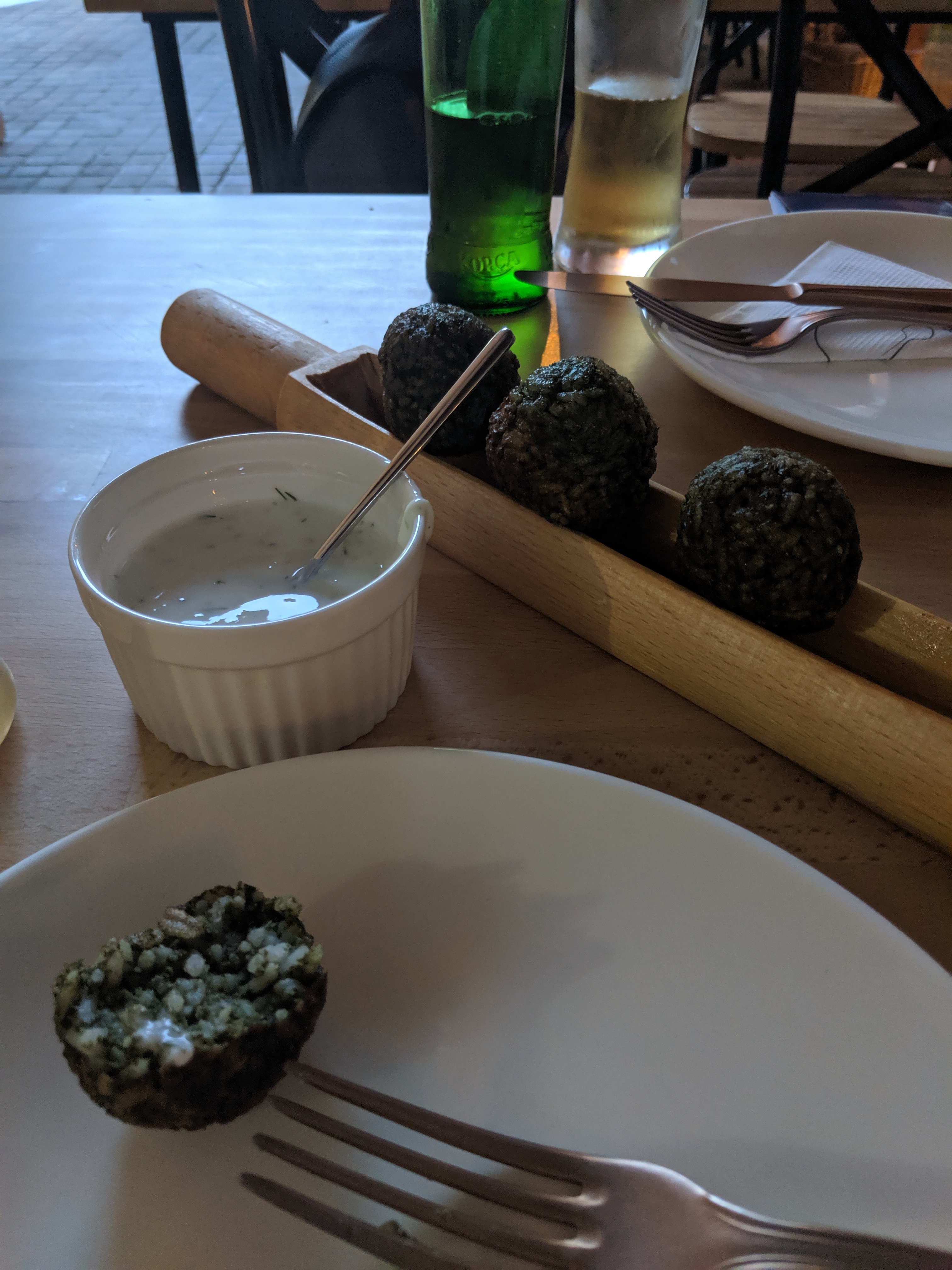 Хапнахме нещо, което не беше кой знае колко традиционно, но беше доста вкусно. Водеше се ресторант с органична храна като Цвети хапна нудли с пъстърва и орехи, а аз хапнах телешко печено и отделно оризови кюфтенца с джоджан. Като цени не бих казал, че Албания е много по-евтина от България. Вечерята си ни излизаше 40-50 лв отма, дори и бързата храна беше на същите цени като при нас, дори малко по-скъпа. В курортите колата си беше по 2.40, бирата си беше по около 3 лв, не беше кой знае колко евтино.