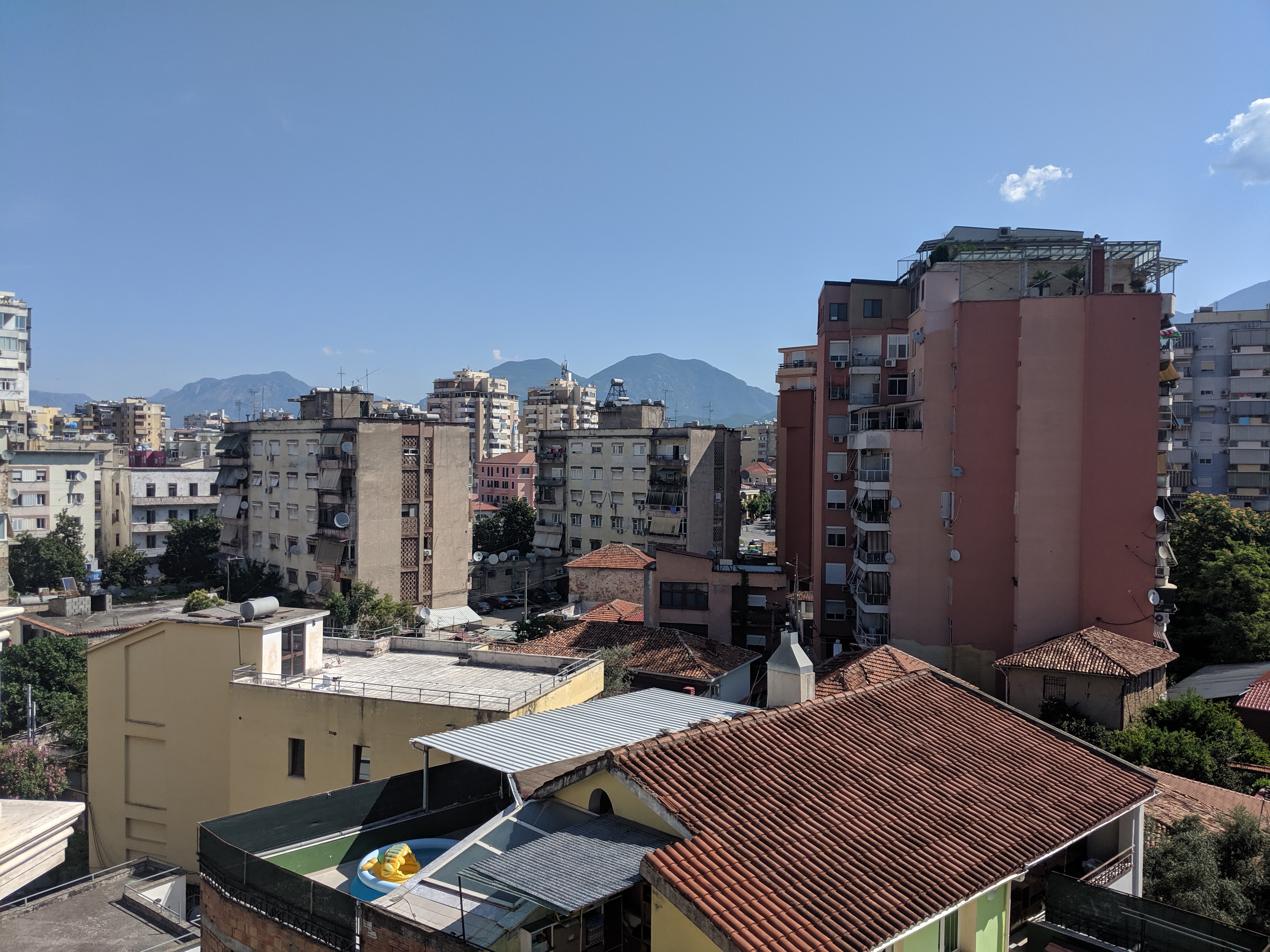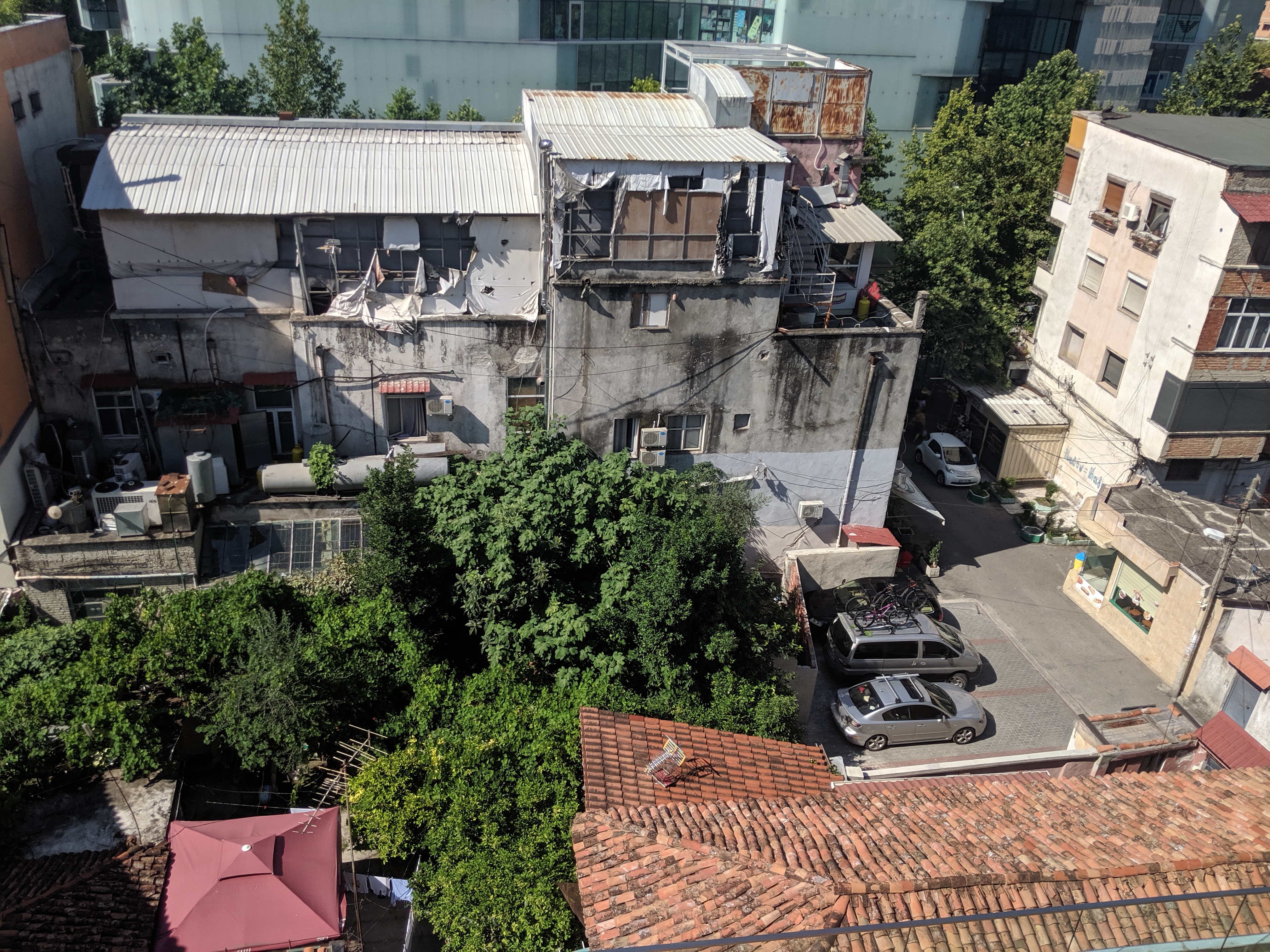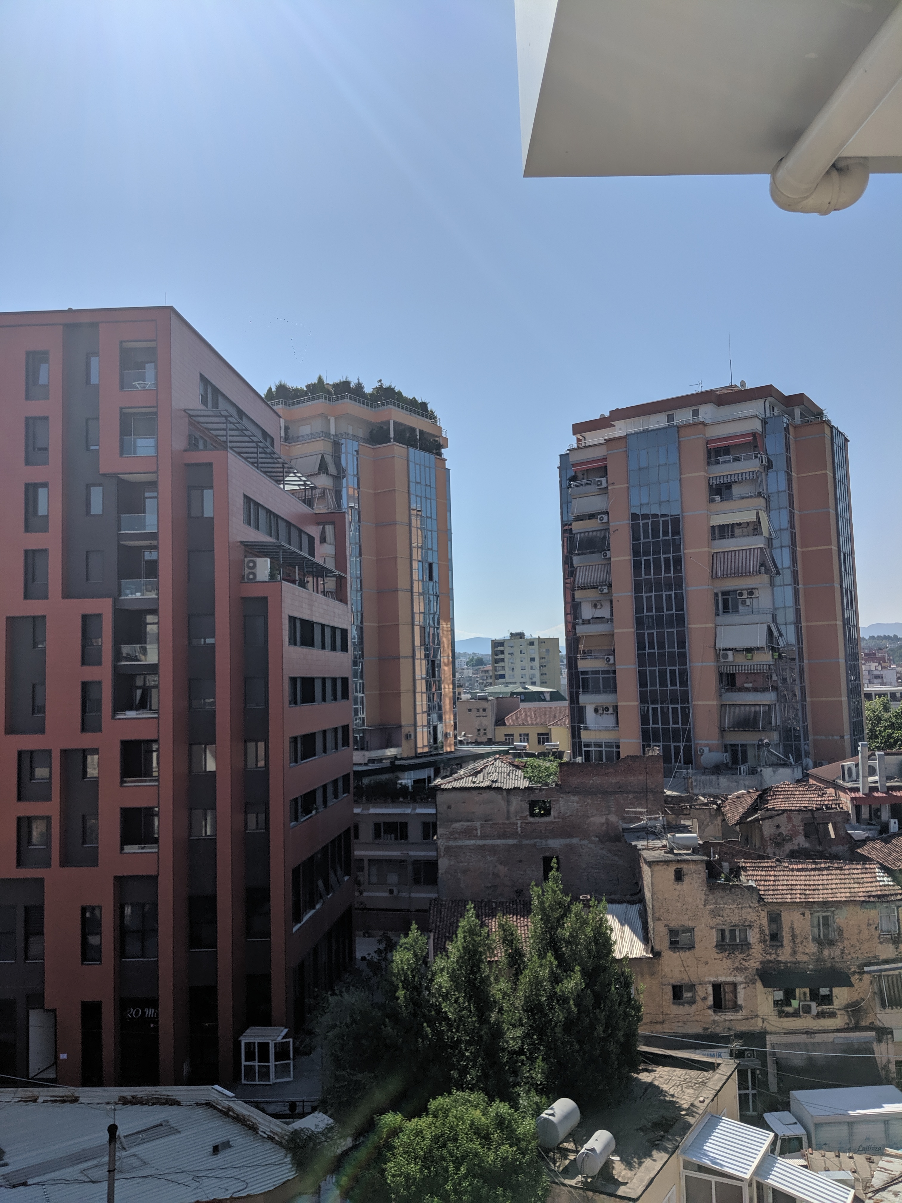 Иначе в самата Тирана останахме в хотел Оксфорд. Хората от хотела говореха перфектен английски, а и имаше малък паркинг, който ме улесни с паркирането в центъра на града. Хотелът беше много чист и приятен и определено ни спечели на фона на мръсотията, която беше около него. Ето как изглеждаше гледката навън: