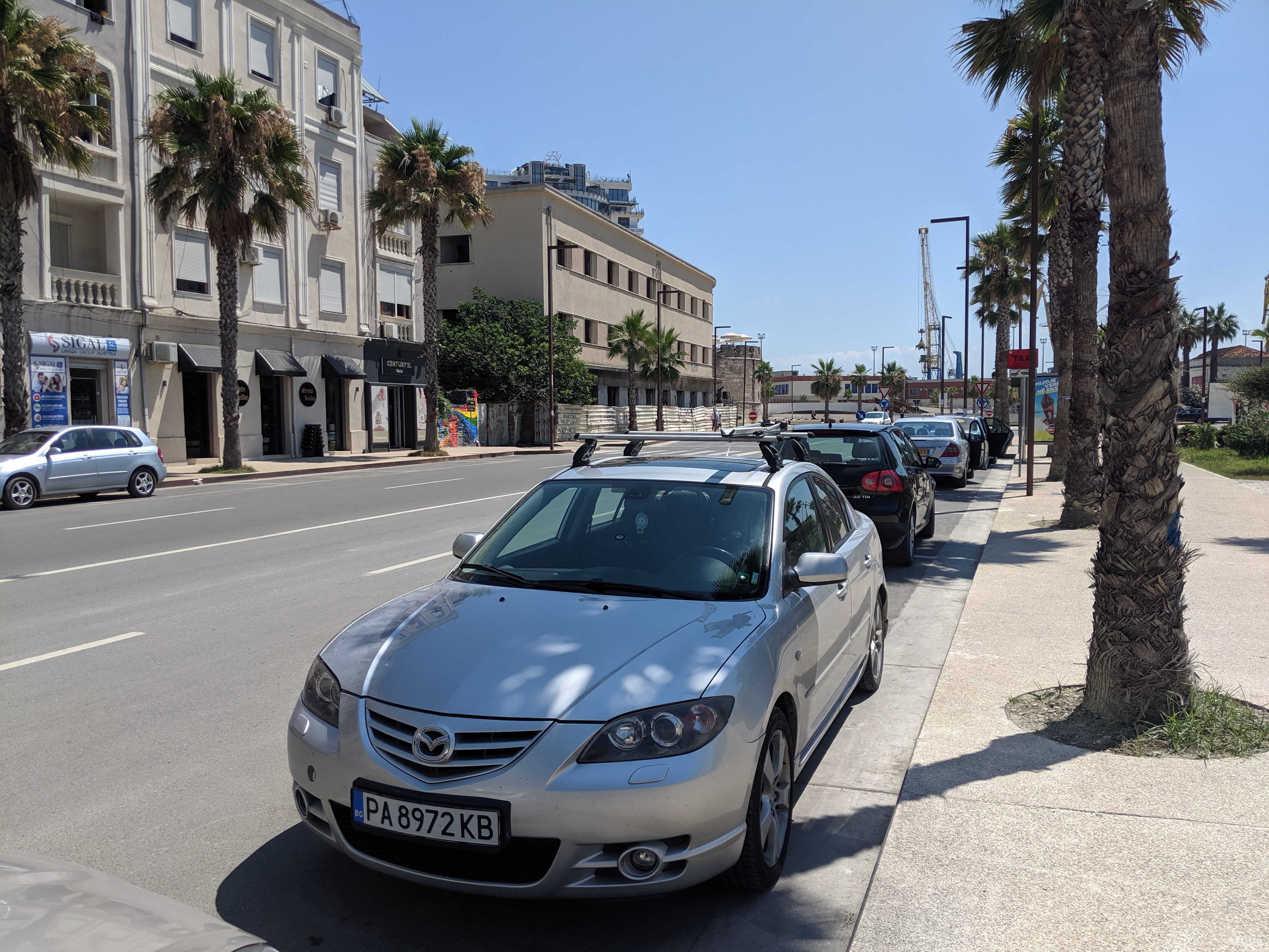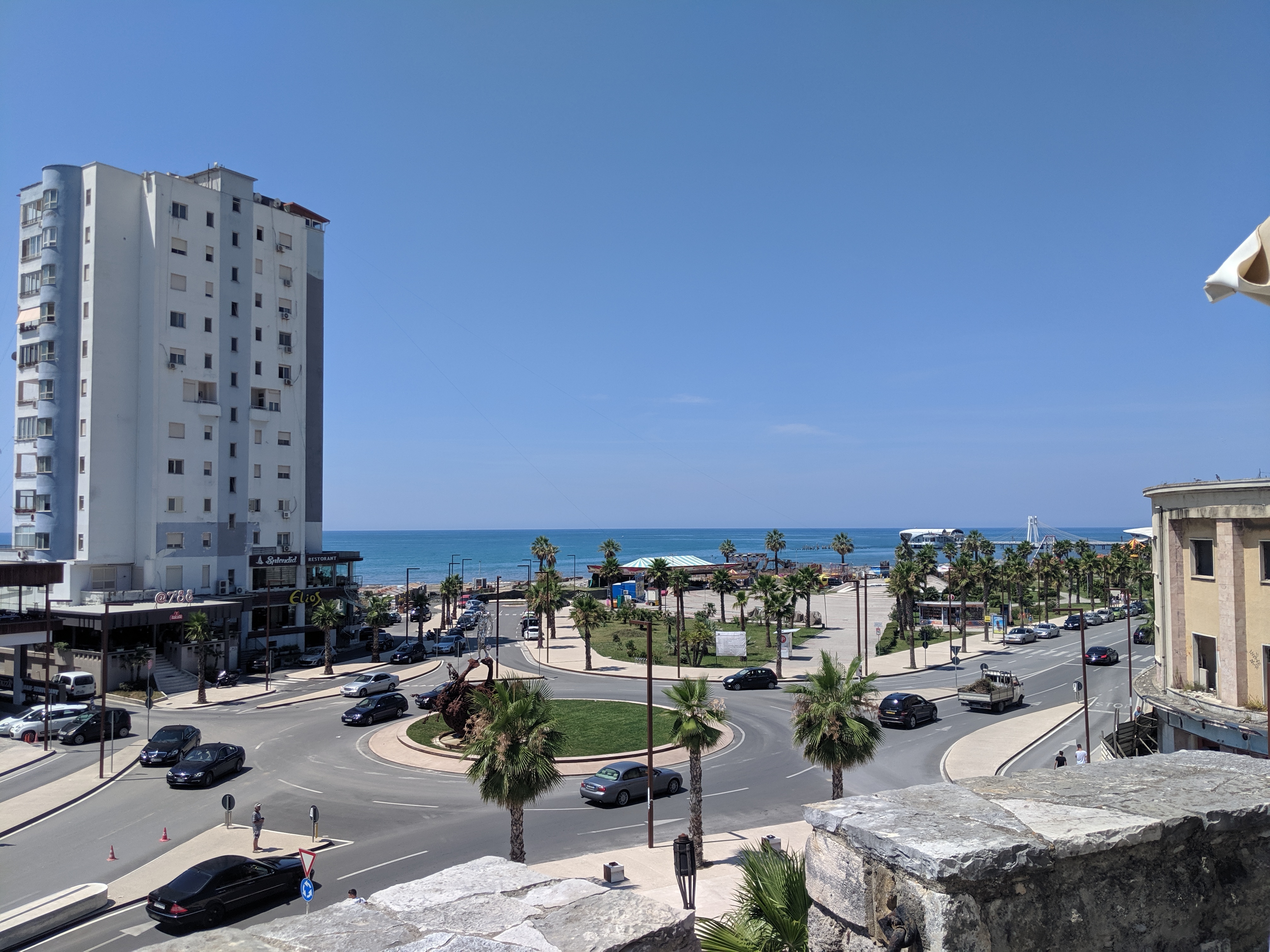 В крайна сметка стигнахме Драч без особени проблеми. Оказа се, че паркингът покрай плажа е безплатен като спрях доста близо до кулата подобна на тази в Солун, на която са направили кафе отгоре.