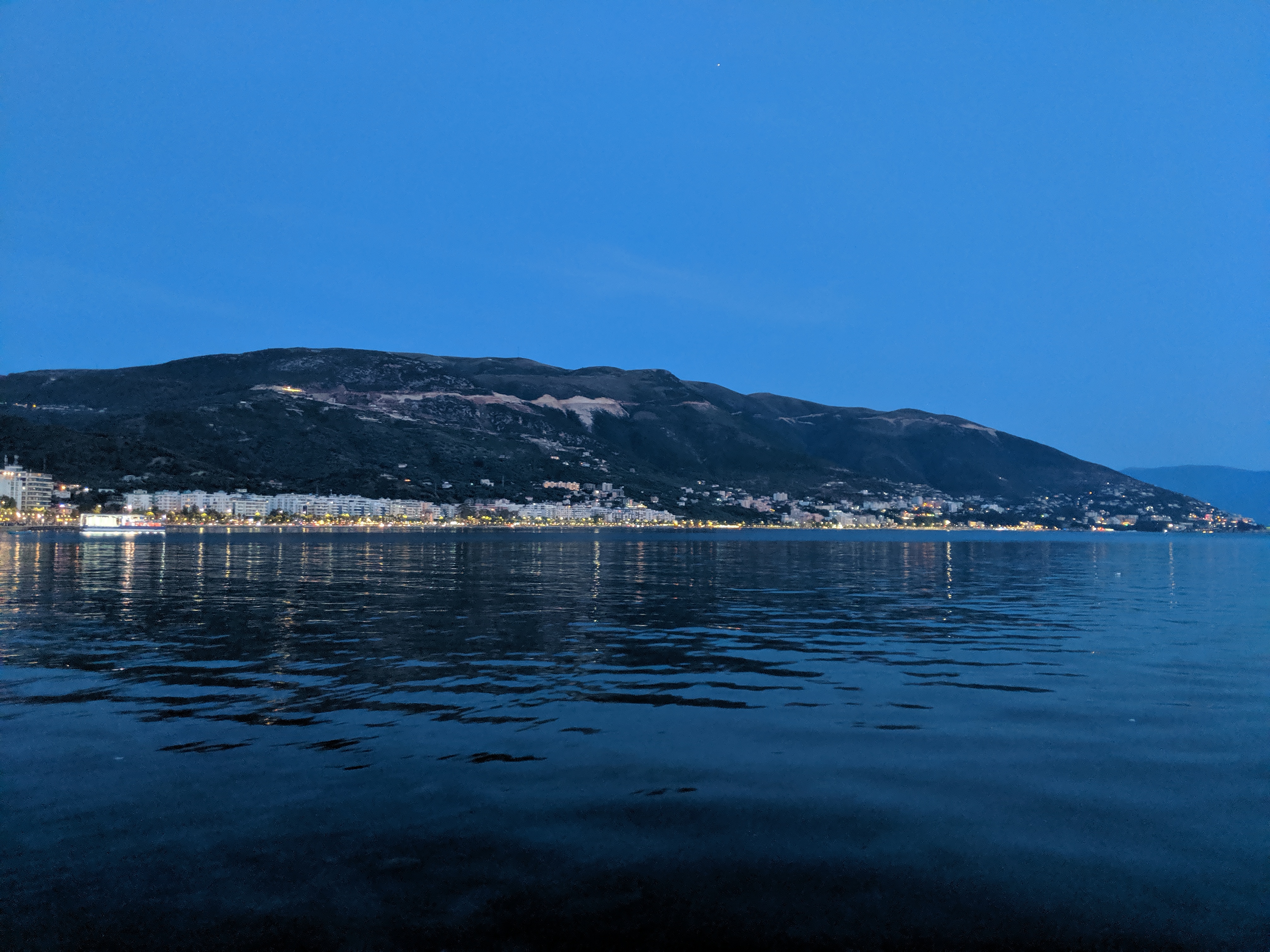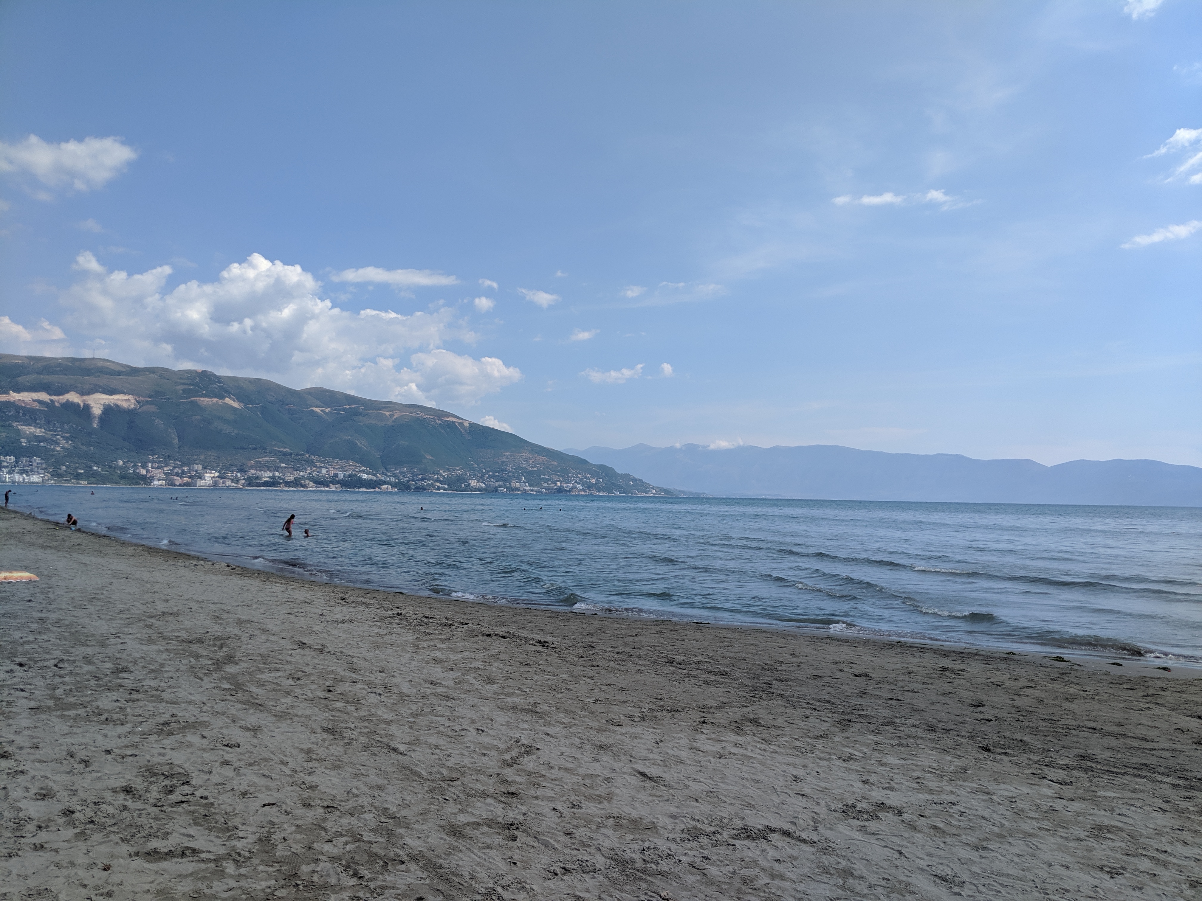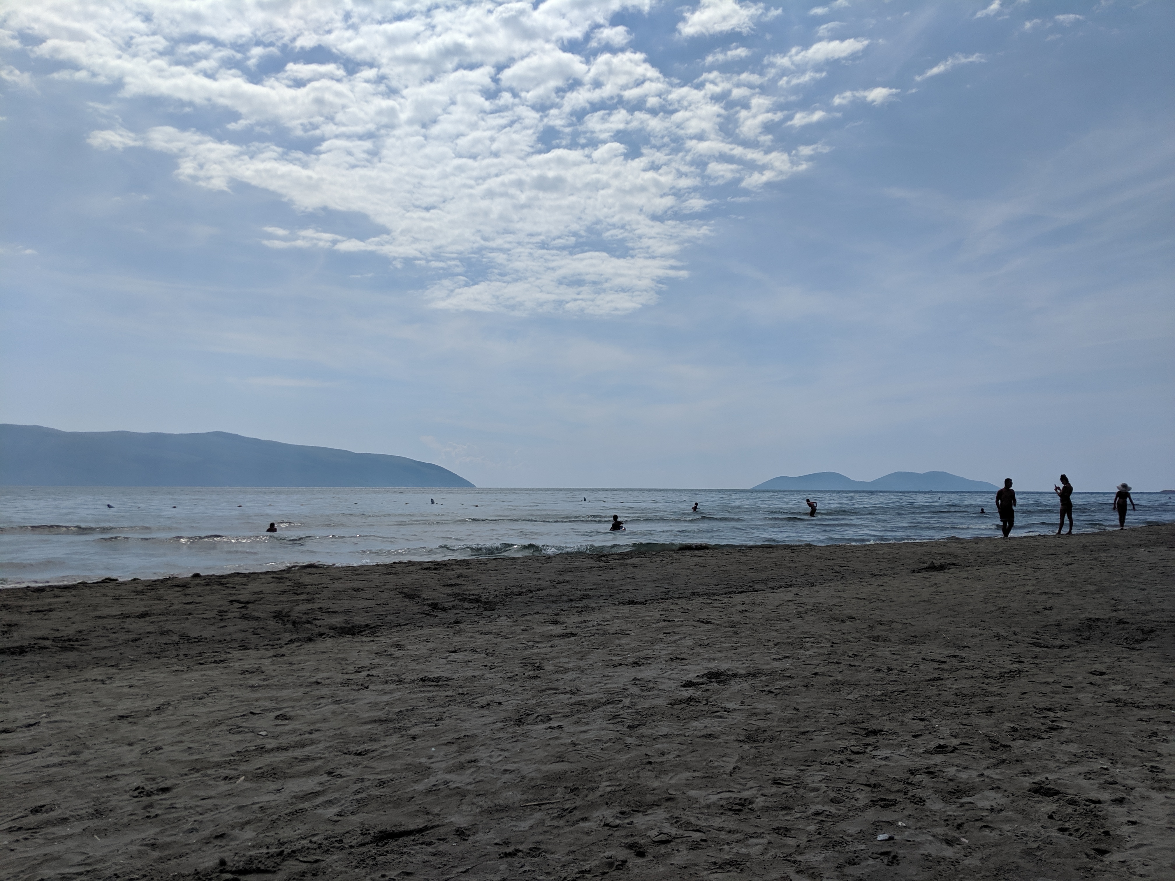 Отидохме на плажа и гледката беше невероятна. Виждаше се планината, виждаше се и остров Сазан. Беше много красиво да гледаш море и планина на едно. Водата обаче не беше очарователна. Не беше толкова чиста, колкото очаквахме, а и имаше лек мирис. На следващия ден щяхме да установим как сме се прецакали като не сме останали на южния плаж, където водата нямаше нищо общо.