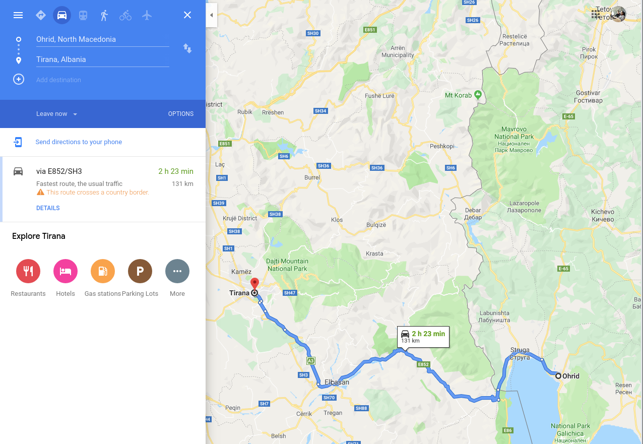 Пътуването до Тирана ни отне около 2 часа и малко. Интересното беше как на пътища, на които се движиш с над 90 км/ч и които се водят магистрала, макар да нямат аварийна лента, се продават печени царевици за по 50 лейки броя. Забравих да спомена, че албанската валута е Leke (лейки) като 100 лейки са 1,60 лв. Та по 80 ст. броя. Спираш на магистралата леко в страни, купуваш си и продължаваш. Отделно се продават плодове и каквото се сетиш.