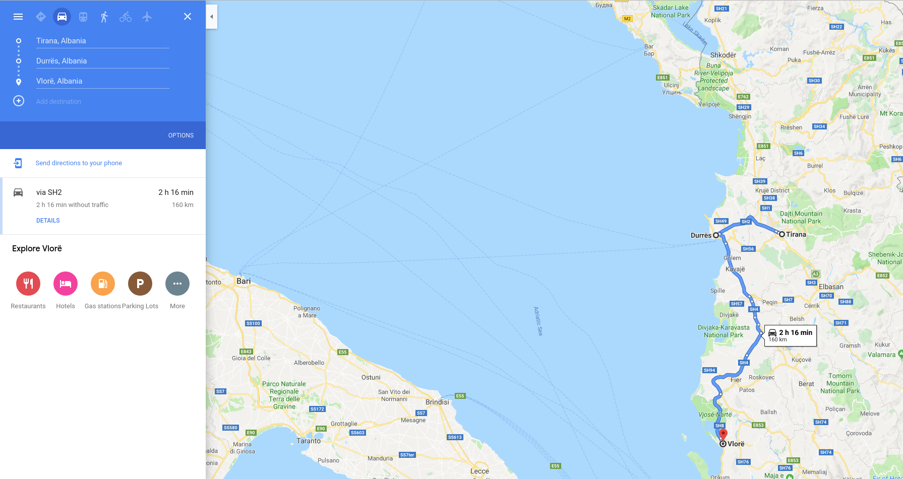 Пътят до Вльора преминава през една нова магистрала, която все още се строи, но двете платна от едната ѝ част са пуснати и е перфектна за каране с изключение на 2-3 скокчета по пътя преди мостовете. Забравих и да спомена, че в Албания не се плащат никакви пътни такси!