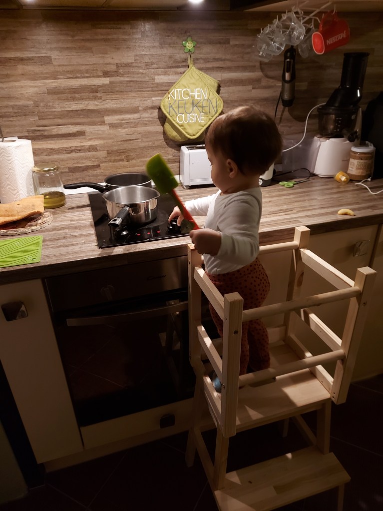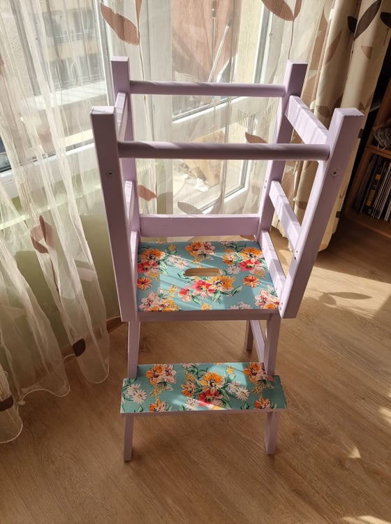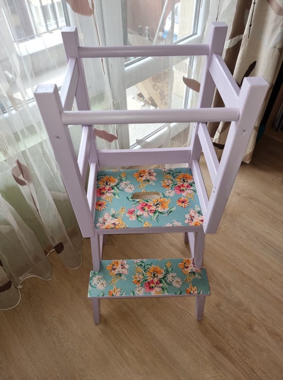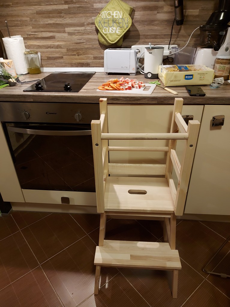 Все още стълбичката продължава да е изключително полезна за малката. Не спира да се качва да готви или пък да си мие ръцете. Махнах втората греда отзад и сега сама се качва и слиза. А с малко занимавка от жена ми, придоби и един доста по-хубав вид: