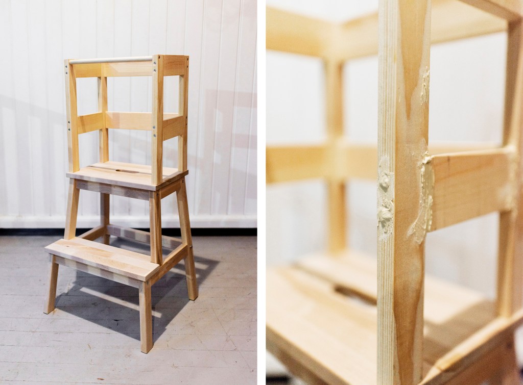- Сглобете стъпалото както си е показано в указанията на ИКЕА. Оставете единствено гораната част на последното стъпало несглобена, тъй като за нея ще се закачи обърнатата наобратно табуретка