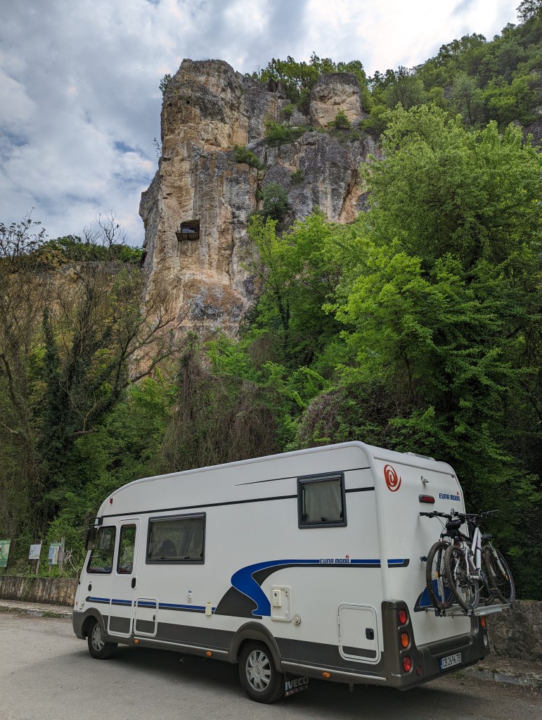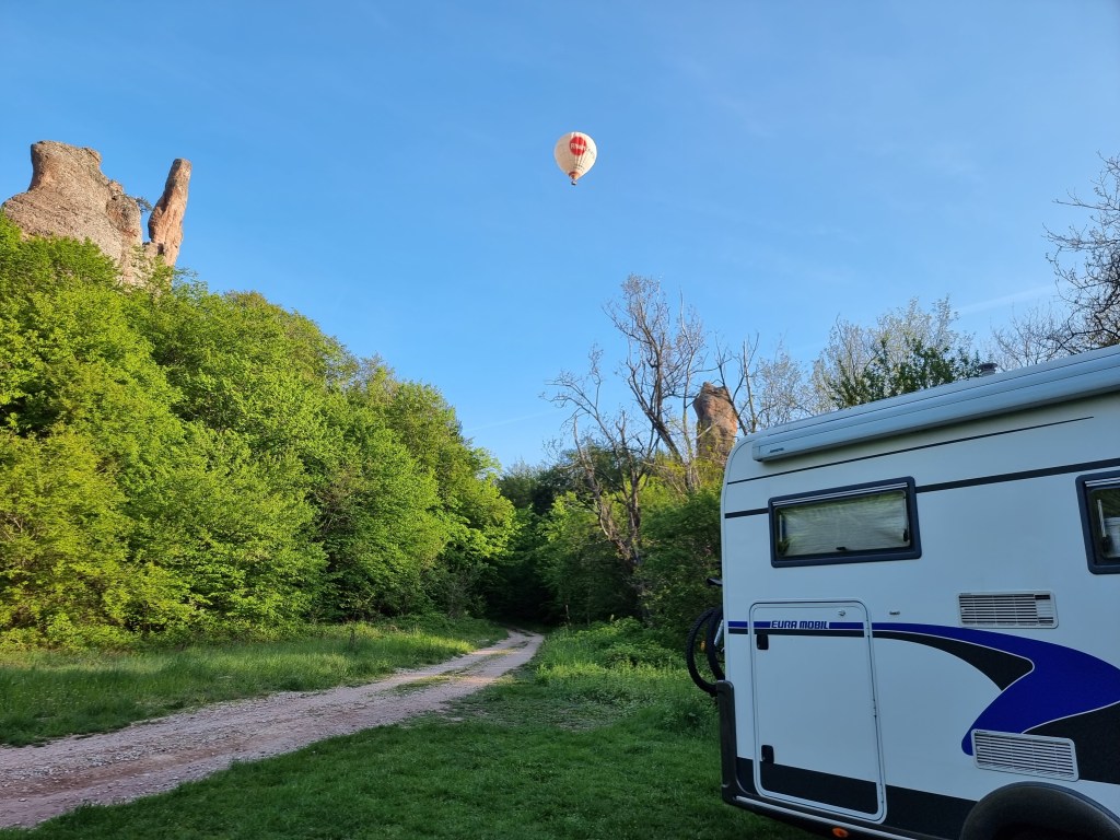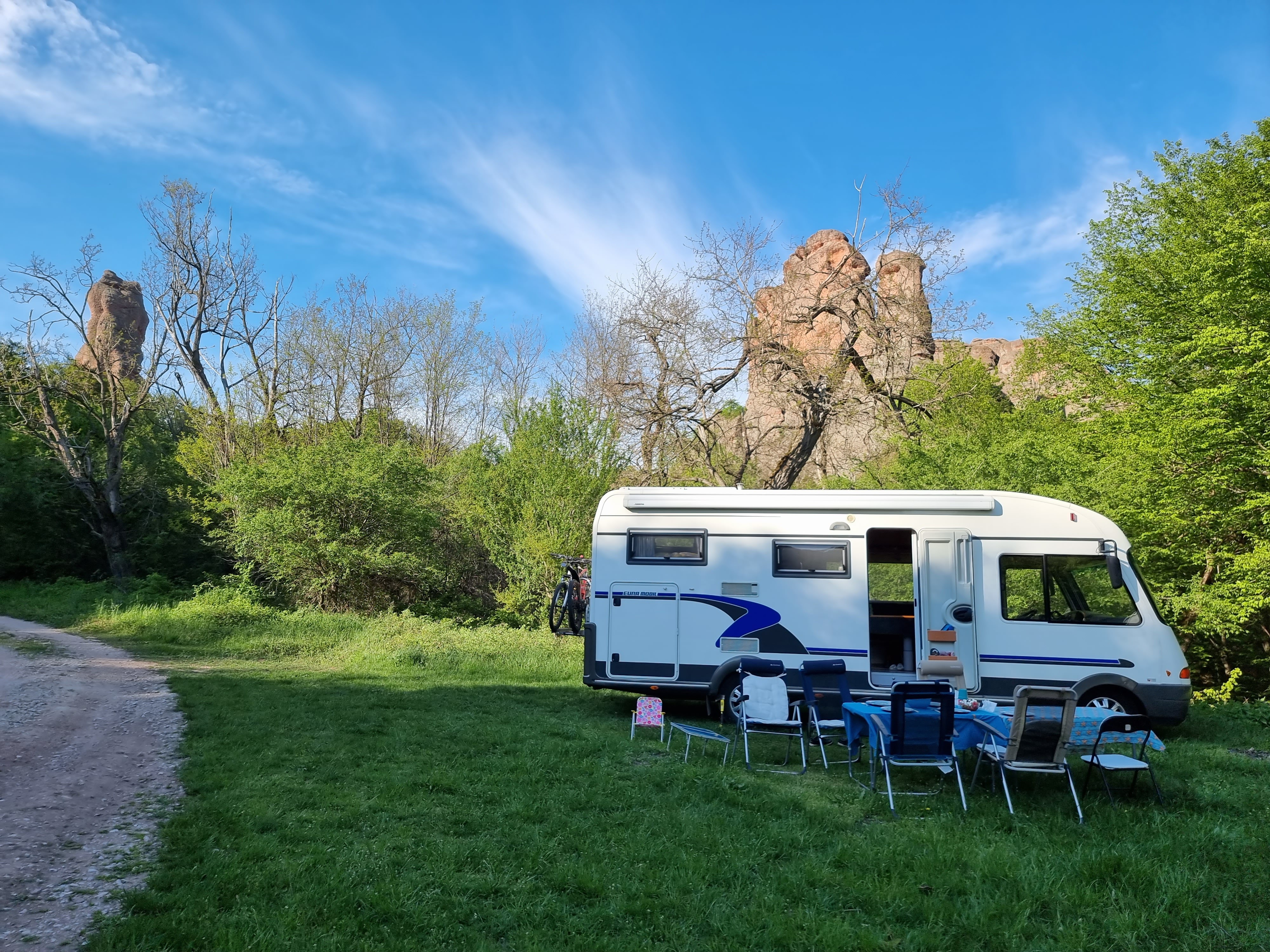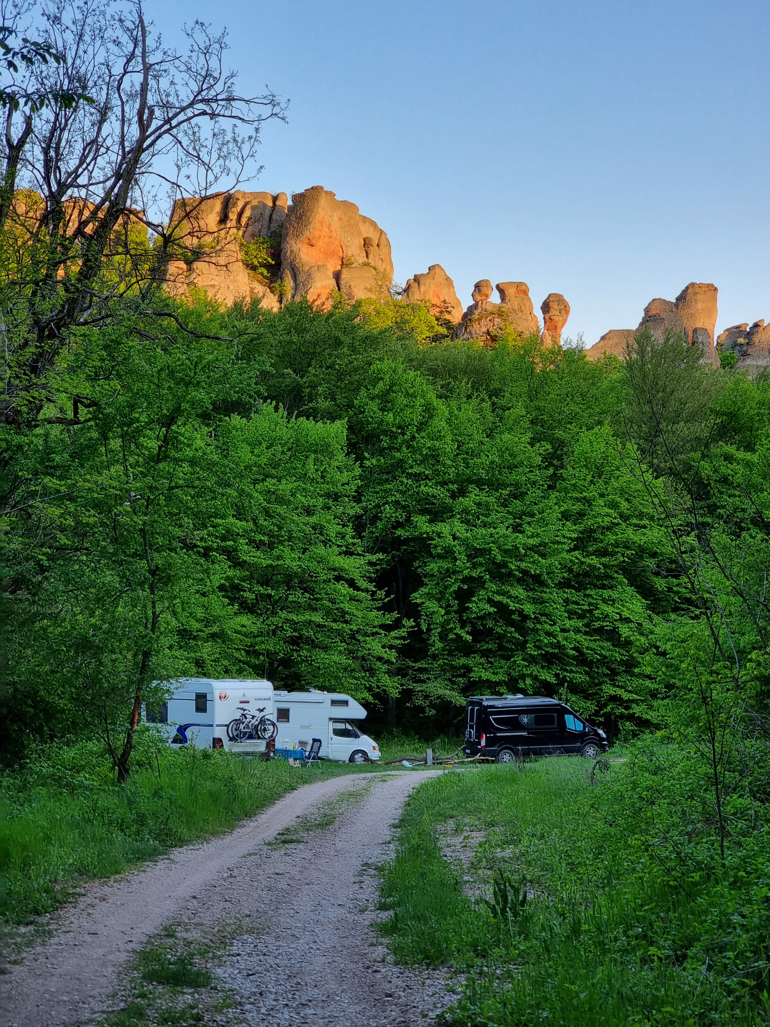 Нощувката ни за първа вечер решихме да направим горе на паркинга на Белоградчишките скали. Самото качване до там си е стръмно и ще е много неприятно ако дойде кола насреща, но нямахме проблеми. Все пак автобуси с хора се качват до горе, така че и ние трябваше да успеем с нашия малък автобус. Отидохме точно след 16 часа, когато повечето хора вече бяха напуснали и освободили места, където можем да спрем. Отдалечихме се от паркинга и паркирахме отстрани на пътя в близост до една горичка. Мястото беше прекрасно и с хубава гледка към скалите. Чуваха се птичките и особено сутринта беше истински рай с посрещане на изгрева от върха на скалите с чаша кафе в ръка.