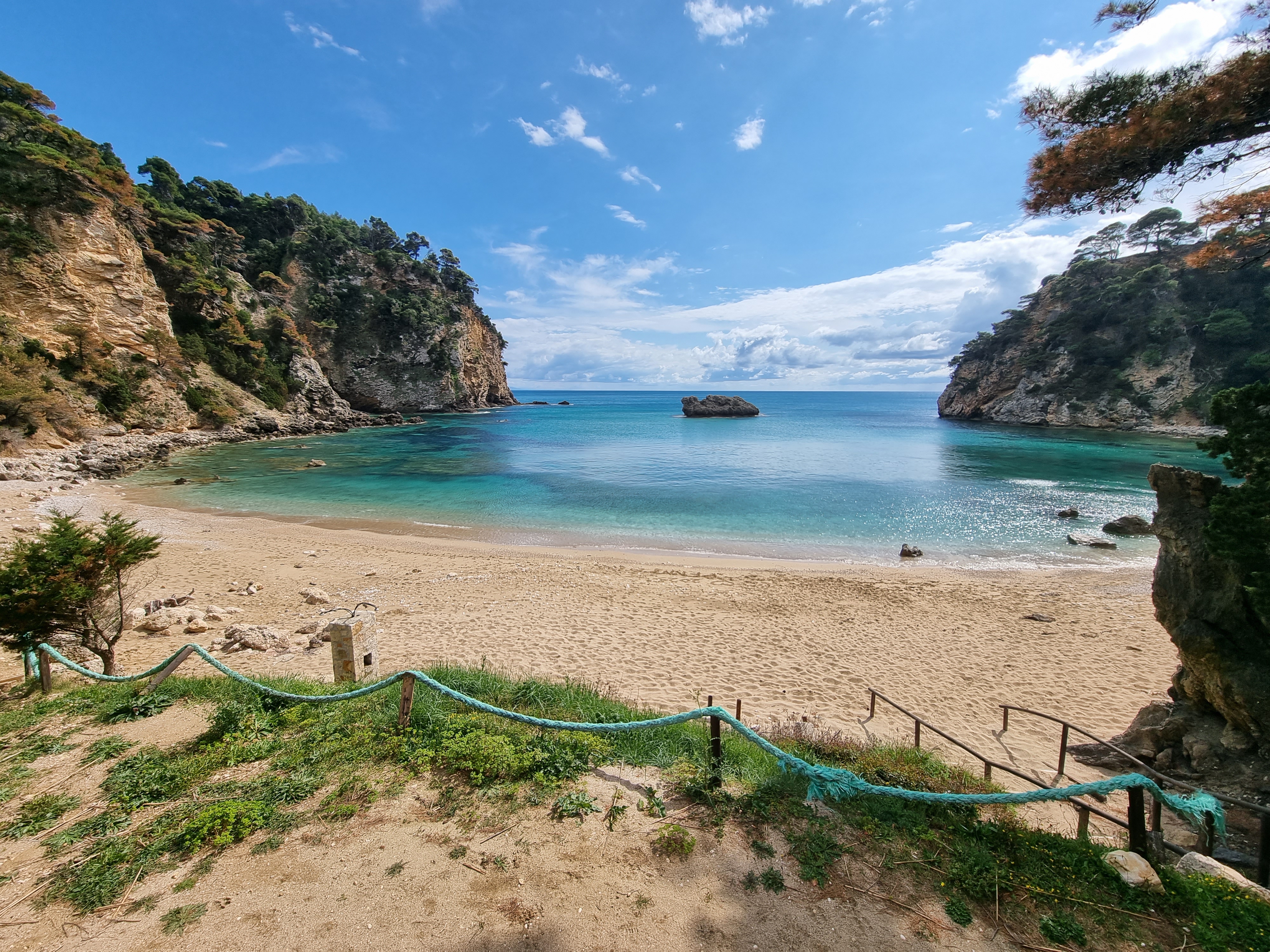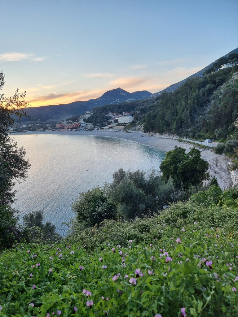 Плажът изглеждаше уникално. Нямаше никой и бяхме сами на паркинга над него. Направихме си рибата на открито с тази прекрасна гледка. Беше малък залив с една голяма скала в средата му, като откриваше очарователна гледка напомняща Болата във Варна. Можеше да му се насладиш както от високо, така и долу на самия плаж, където за мое очудване си беше доста песъчливо и липсваха белите гръцки камъни, които да ти масажират гърба, докато се излежаваш.