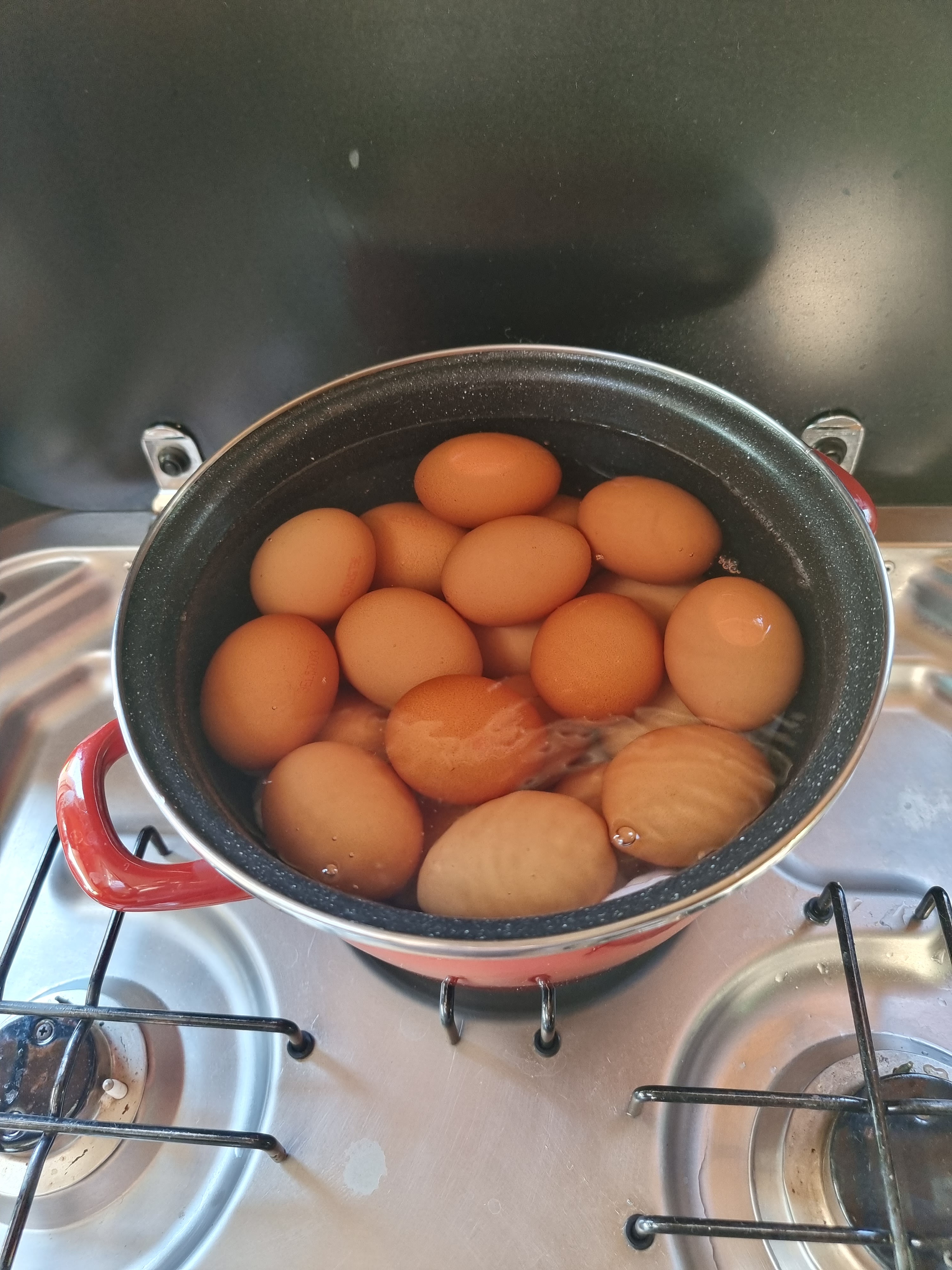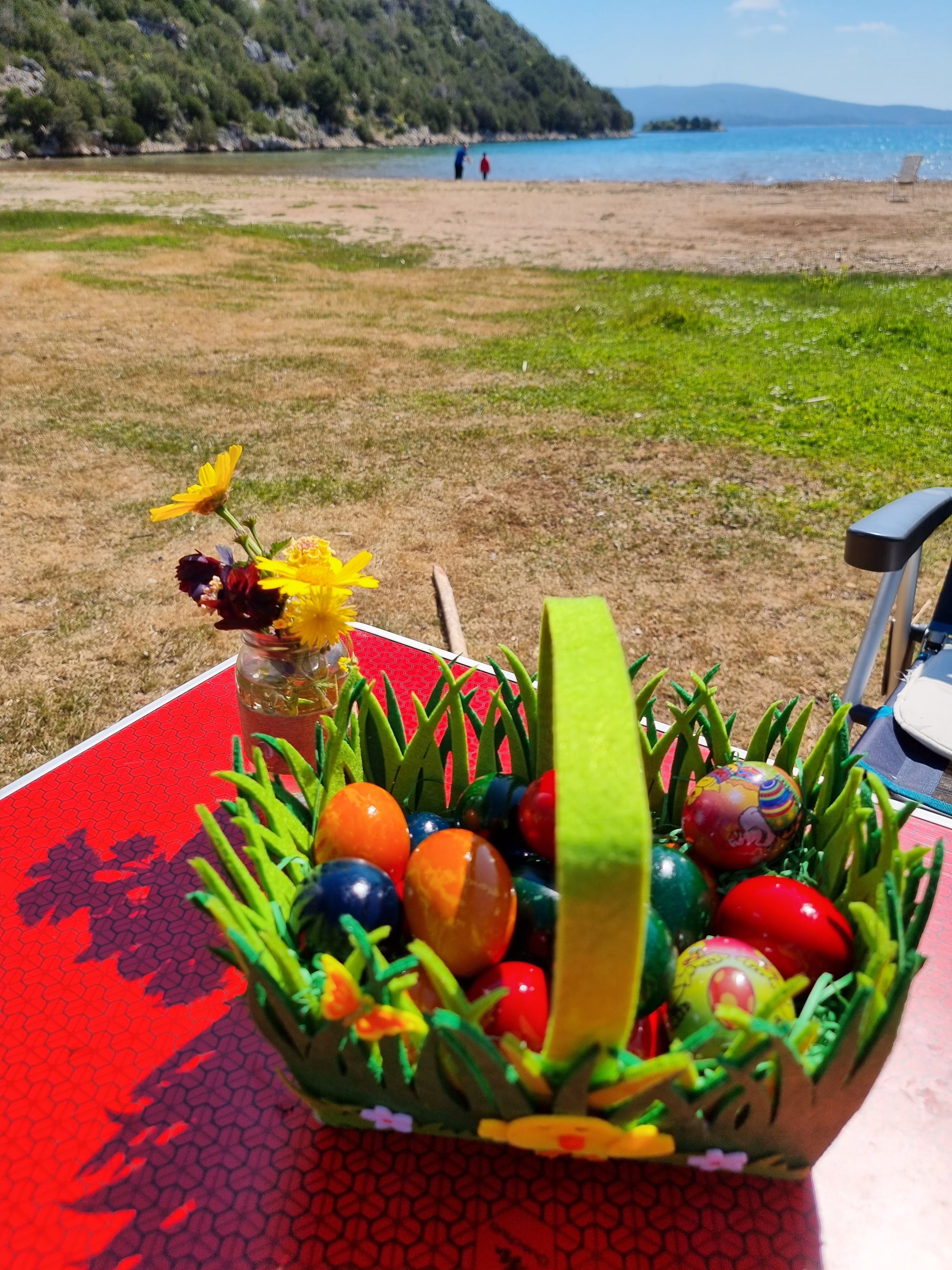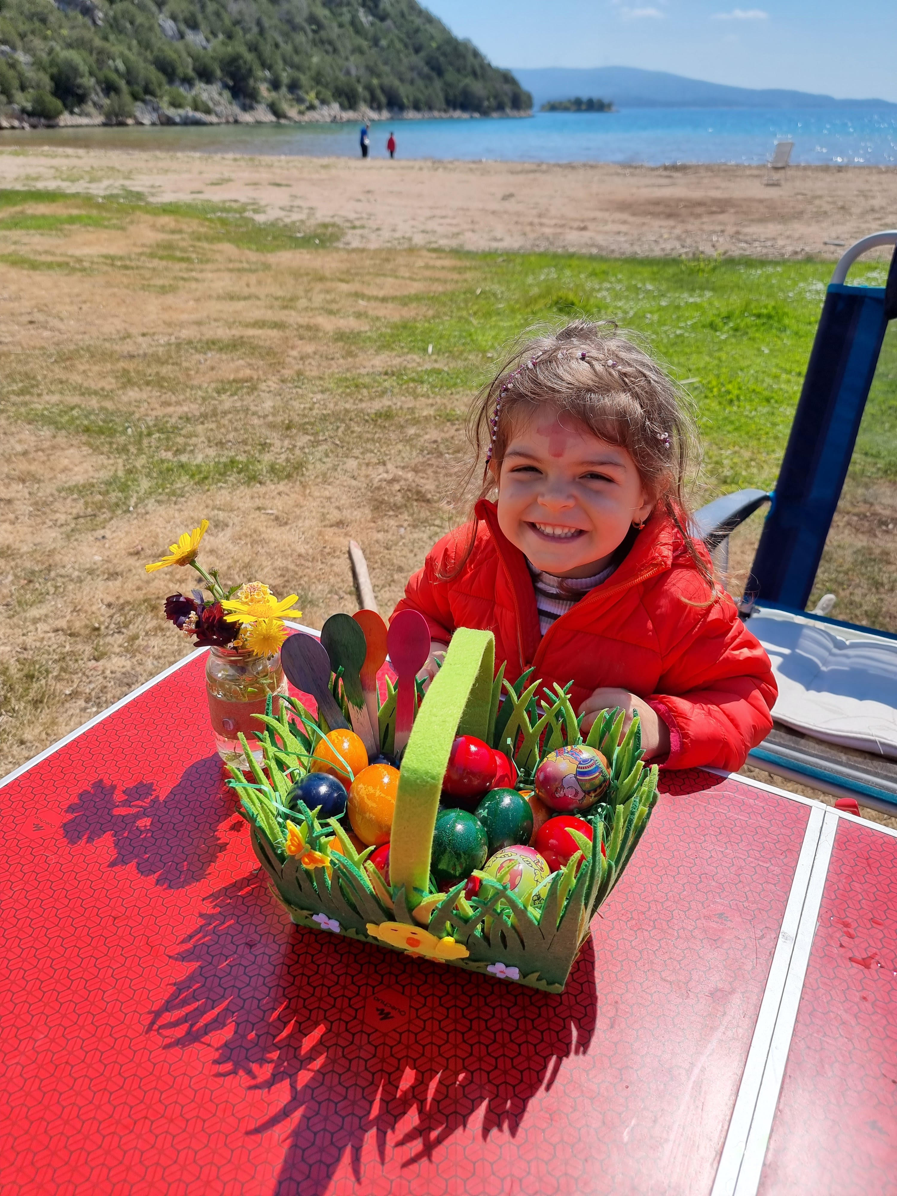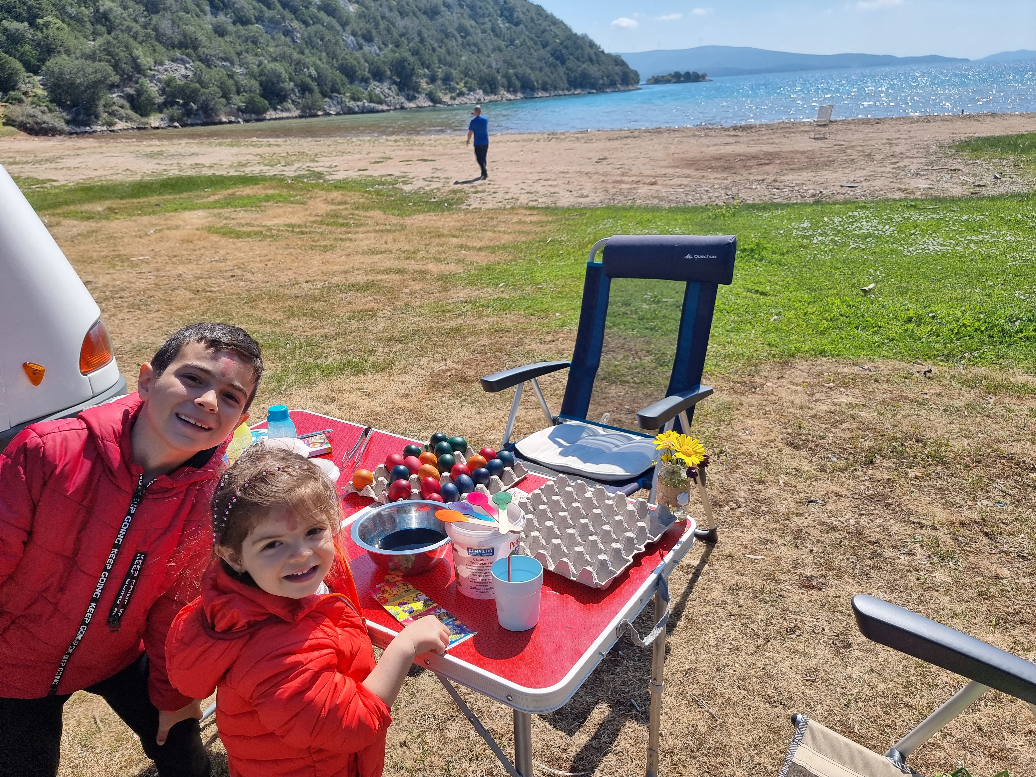 Беше време да боядисаме яйцата, затова децата се захванаха с важната задача. Денят го изкарахме в игри и разговори с другите кемперджии и палаткаджиите около нас. 2 немски момчета бяха тръгнали на велопоход от Гърция до Хърватия и явно все още бяха в началото му. Бяха останали на палатки като ни предложиха дори да ни вземат нещо от магазина, който бил на 7 км. Ние, както винаги, бяхме яко натоварени с всичко и накрая се оказа, че Цвети ги понахрани със спагети, козунаци, банани и 20 литра вода почти. По едно време се усъмних, че май иска да ѝ свалям колелото и да тръгва с тях, но явно не е чак толкова амбициозна да върти още 700-800 км, пък и 2 момчета на палатки будеха в мен съмнения за ориентацията им. Добре, че поне спяха отделно.