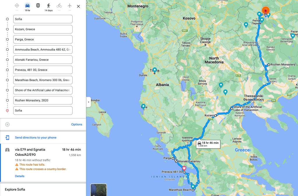 Планът беше да тръгнем от София за Гърция в петък като изкараме 9 дни общо навън и се приберем в неделя. Планът ни беше доста мъгляв и неясен като планирахме ден за ден. Нямахме набелязани места и в общи линии набелязвахме по път. Но ето и един списък, който се очерта след пътуването ни: