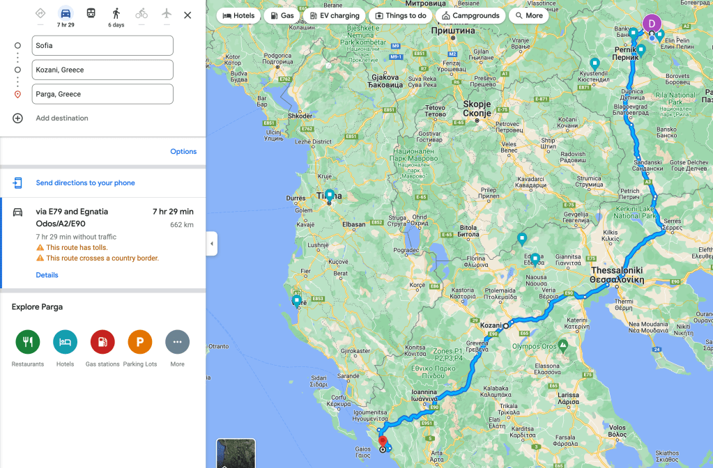 Сутринта беше хладна, но достатъчно приветлива, че да ни позволи да направим любимия кус-кус на децата и да тръгнем за онова голямото синьо небе на земята, наречено море. Е, преди това трябваше да започнем с драмата, която беше, че двете деца, които се натъпкаха с чай в 10 вечерта, решиха да оставят следите си и на двете спални в кемпера още на първата вечер навън, за да им е по-уютно в следващите 10 дни. Понякога има и такива моменти, в които уж отиваш на почивка, а вече ти се прибира вкъщи. Както и да е, хапнахме набързо и газ към Парга. Пътят до Парга беше напълно нормален, равен асфалт без дупки, тук-таме скокчета да те събудят да не дремеш зад волана. Достъпът е лесен, макар като приближиш градчето да става малко тясно и трудно за разминаване, но е само за кратко.
