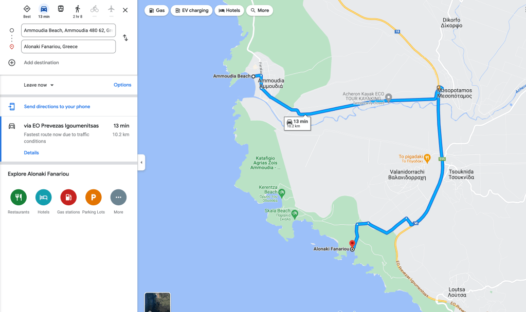 Плаж Алонаки е отново на скромните 20 минути каране от Амоудия. Хареса ни, защото на снимки изглеждаше много красив и си заслужаваше да минем да го посетим. А снимките ги гледахме в park4night между другото. По пътя за там Гугъл Мапс отново ни показа, защо не може да ѝ се има доверие в Гърция. Отново ни показваше как да стигнем като цепим през маслиновите лозя и направим кемпера на нищо. Понеже вече я усещам кога бърка, този път обърнахме наобратно и хванахме правилния път за плажа, който минава през селцето Валанидорахи.
