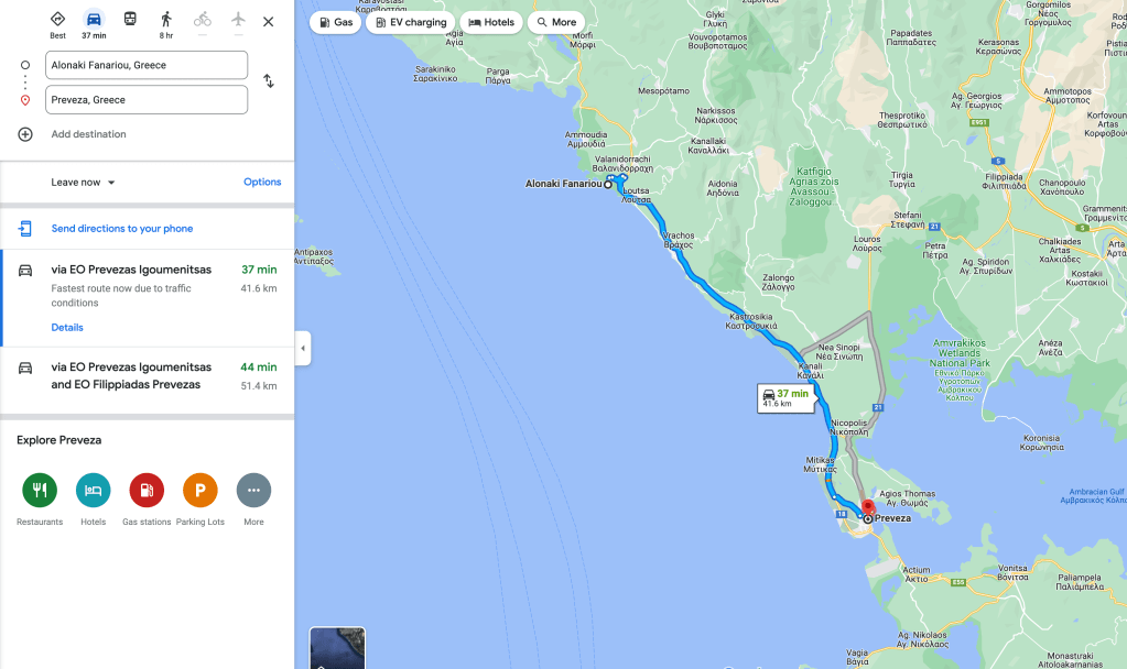 На сутринта след закуската беше време да се поразходим, както и да потърсим място за пране на дрехи. Има доста такива в Превеза, тъй като пристигат много чуждестранни пътешественици с яхти на пристанището. Преместих кемпера около 2 км по-навътре в близост до центъра, ето тук. Нямахме проблеми извън сезона, имаше доста места за спиране, но вечерта вече бяхме наобградени от коли.