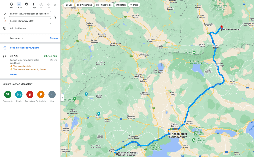 Пътят от София през Кулата до Гърция е ясен на повечето, ходили на гости на южната ни съседка. По пътя се гледахме с върховете на Рила и Пирина. Не ни пуснаха тая пролет да посетим планината по-рано и това си му е. Но ще си оправим сметките, веднъж лятото да дойде. Иначе няма какво да обяснявам много, освен че чакахме около час на границата, което рядко се случва, но понеже идваше Великден и хората излизаха в почивка, беше сравнително нормално и очаквахме това. Затова тръгнахме около 15 часа в София и около 18 бяхме на границата. По пътя срещнахме доста кемпери както и на познати, всеки запътил се към своята дестинация. Решихме да караме до Козани, където и да останем на нощувка на следното място. Мястото беше тихо и спокойно, макар да се чуваше шумът от магистралата, нямахме излишни гости от местното население и спахме нормално. Бяхме спрели до неработеща църква, което беше странно за гърците според моите виждания за тяхната религиозност. За съжаление водата на църквата не работеше и не успяхме да напълним за пиене, но така или иначе бяхме напълнили кемпера на тръгване от София.