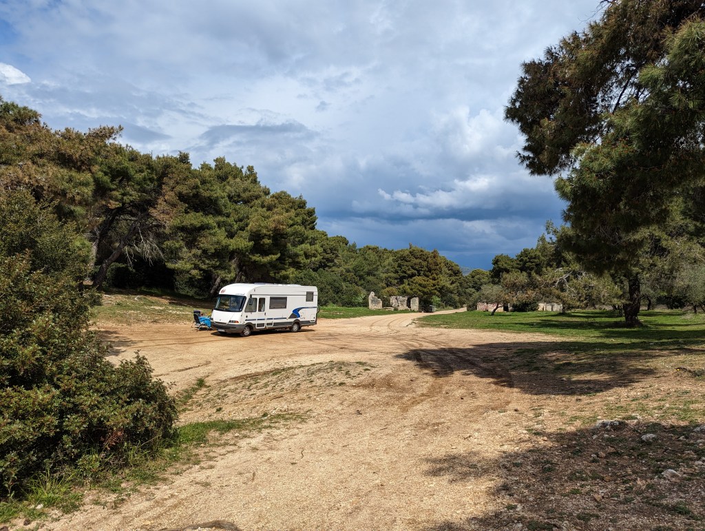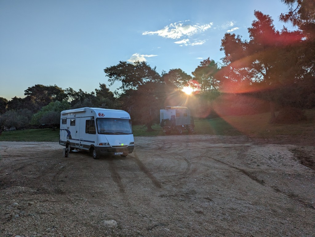Излязохме за кратка разходка из горите в близост до плажа, върнахме се и започнаха да идват и други кемпери на мястото. И както бяхме сами, изведнъж се оказахме с още 3-ма съседа в близост. Един немски зил, превърнат на кемпер и още два буса. Немците май много обичат Гърция, хем топло, хем нямат ограничения, хем сравнително евтино. Запознахме се с младо семейство, които с 3-месечния им син тръгнали с кемпер и от година и няколко месеца не са се прибирали вкъщи. Гледах ЗИЛа им и просто не можех да си го представя. Бащата ми обясняваше, че са посетили Скандинавските държави през лятото, а зимата дошли в Гърция, където и ги заварихме ние.