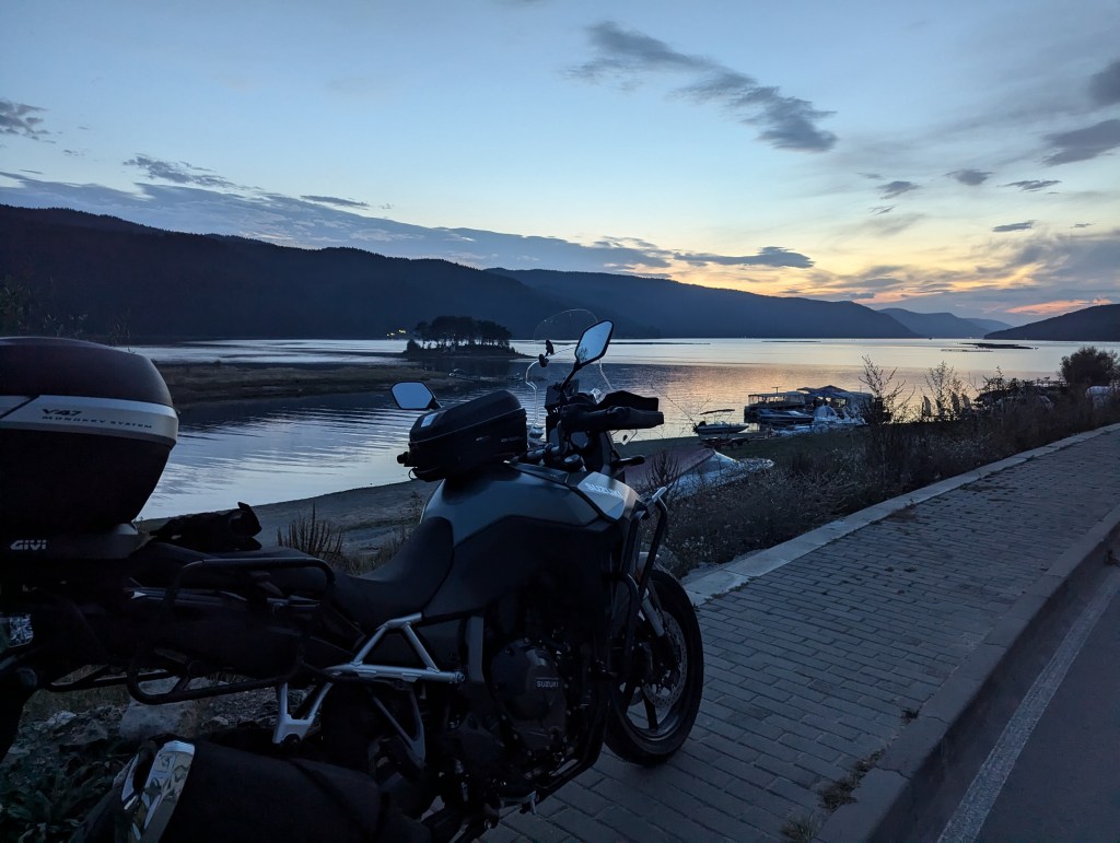 Планът беше да тръгна към София, но се промени и тръгнах към Пещера, от където съм. Реших да мина през Доспат и язовирите там, за да видя дали наистина са толкова сухи, колкото ги изкарват. В почти 6 часа привечер тръгнах към Пещера като спрях да заредя в Смолян, а от там хванах пътя за Широка лъка, Девин и Доспат. Хванах залеза, а какво по-хубаво от това да посрещнеш розовото небе на мотор. За съжаление пътят ме държеше да не гледам много към небето тъй като имаше много дупки между Борино и Доспат, които бяха запълнени с филц, на който мотора занасяше с лекота. Не знам защо бяха взели такова решение, явно трябваше филцът да бъде отъпкан и отгоре да бъде нанесен асфалтът, но само този филц ме изправяше на нокти по завоите и не ми даваше голяма свобода с газта като цяло. Малко преди Доспат пътят се оправи, а след влизането в града спрях да хапна на ръба на язовира.
