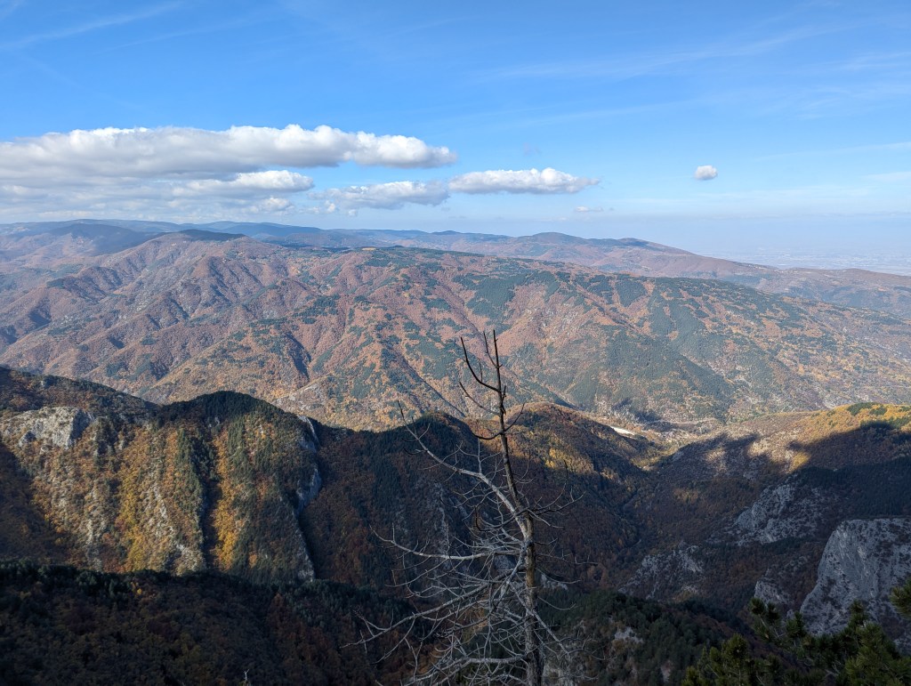 След около час и 15-тина минути стигнахме върха. Гледките бяха невероятни. Склоновете до нас жълтееха на места, сякаш гората не се беше отдала напълно на есента и оранжевото все още не доминираше пейзажа наоколо. Един по-силен вятър щеше да оголи стеблата на дърветата, но въпреки това Родопа все още гореше с цялата си прелест на синьото небе.