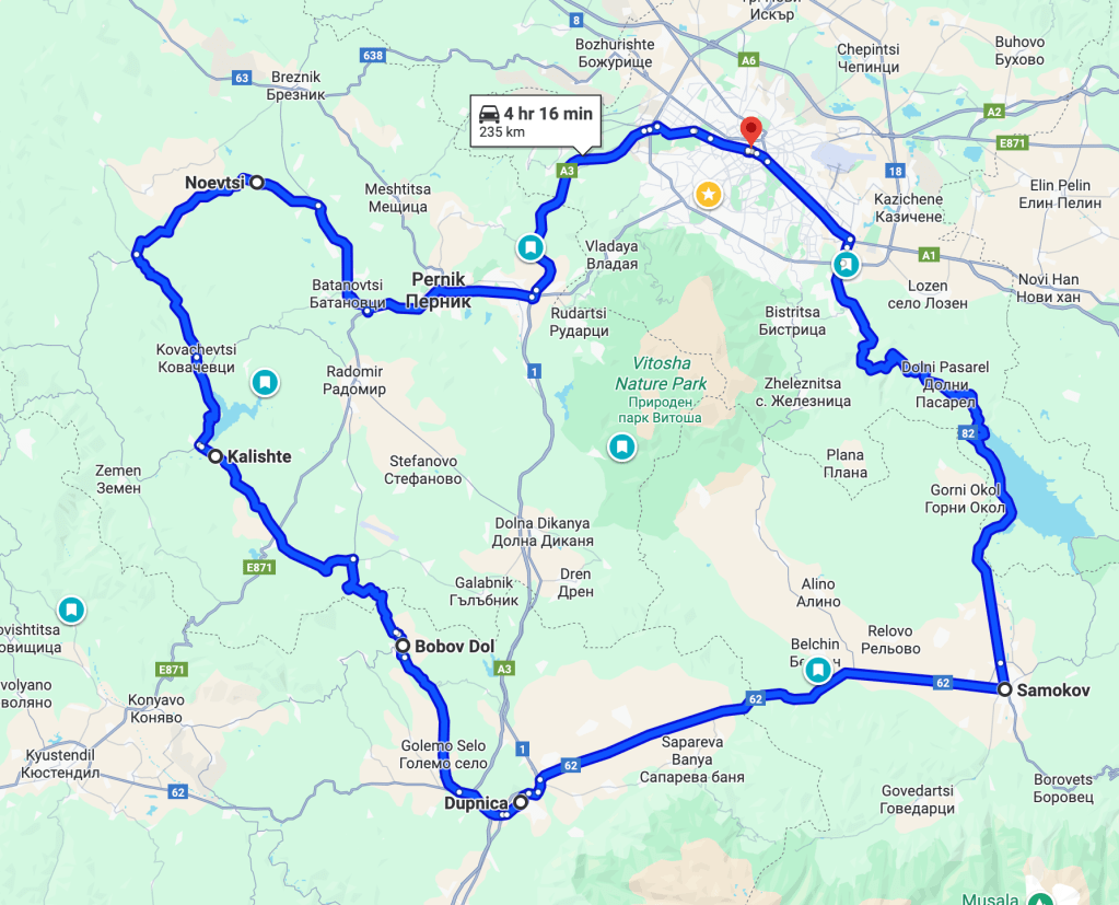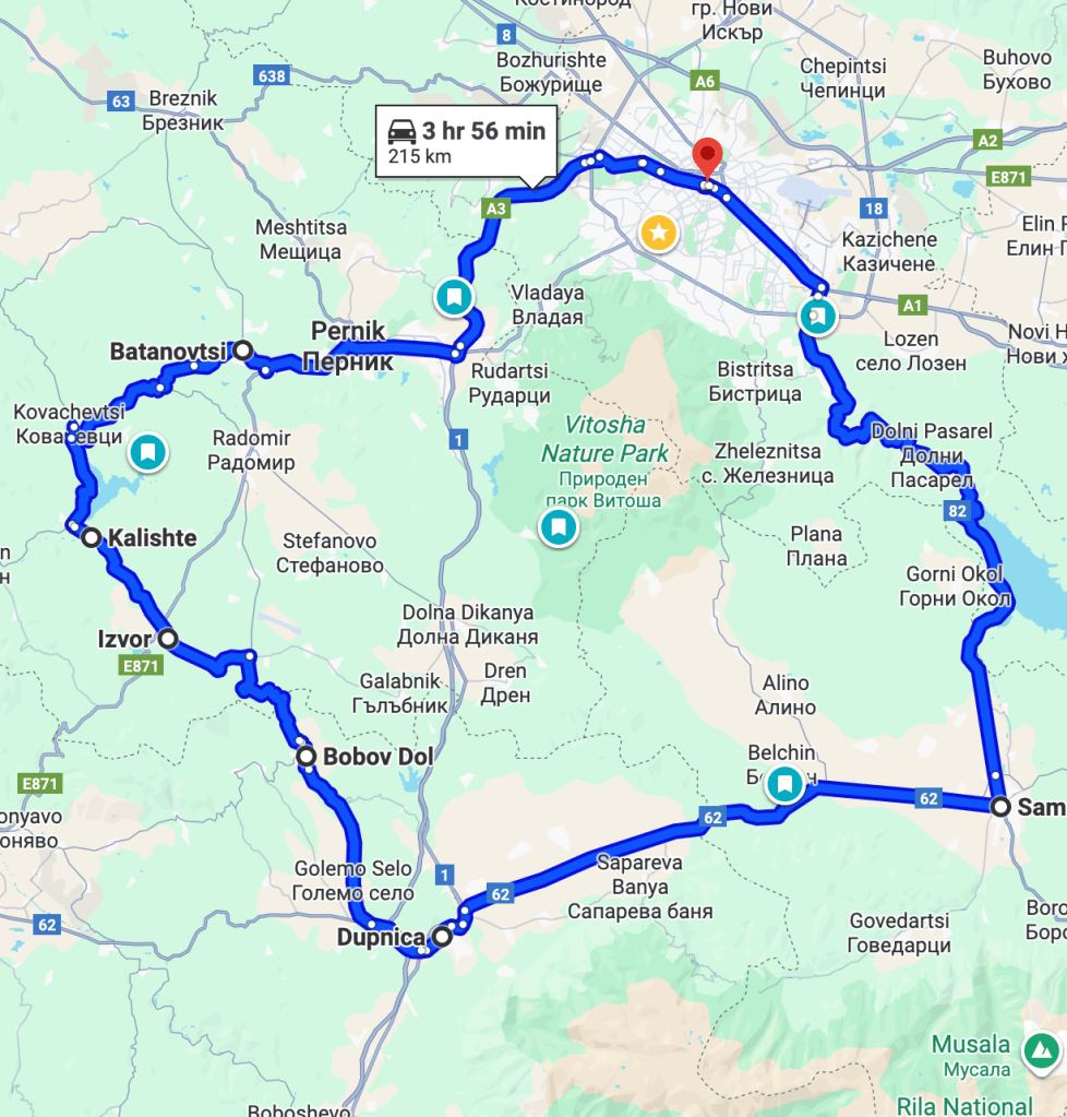 София – Самоков – Дупница – Бобов Дол – Извор – Калище – Ковачевци – Батановци – Перник – София